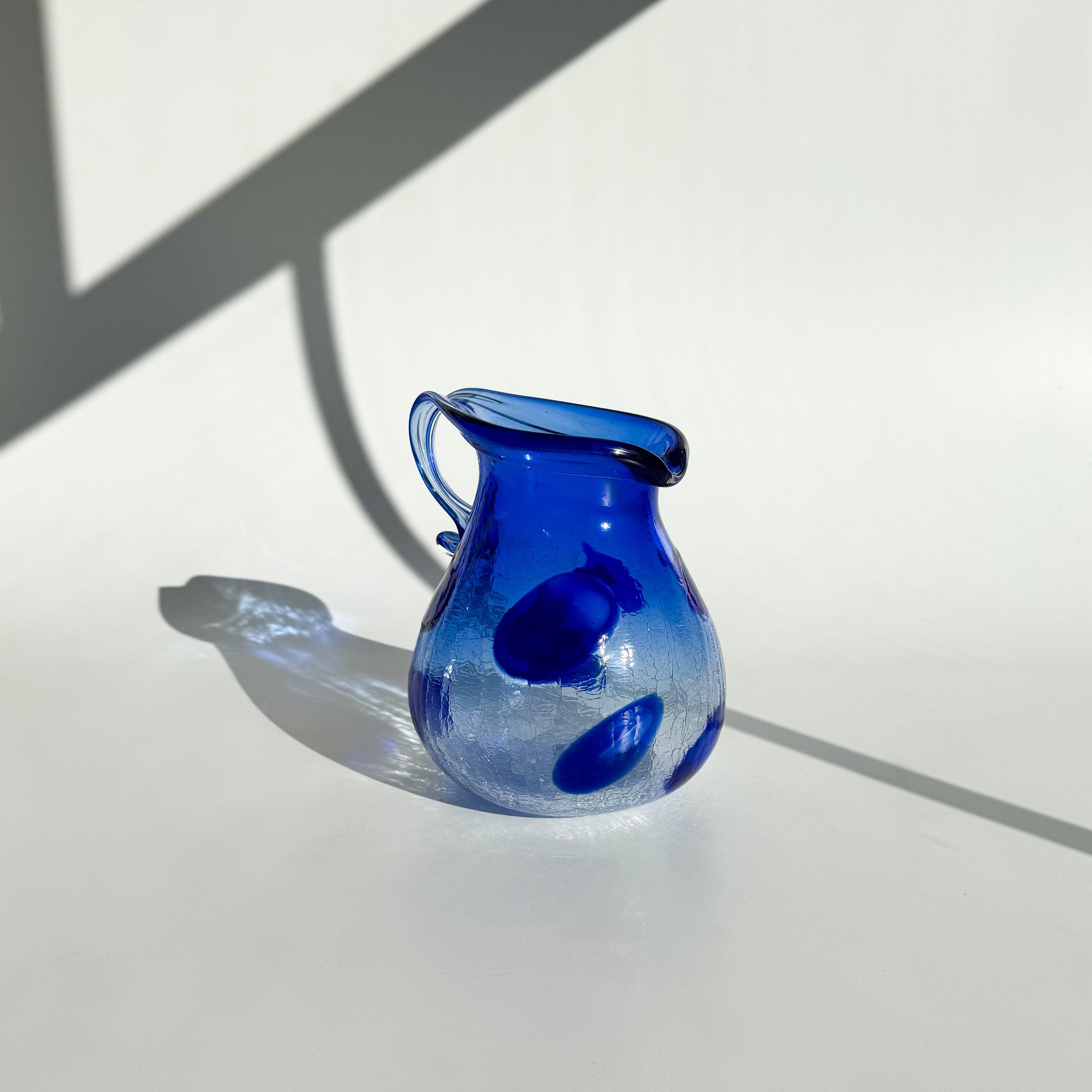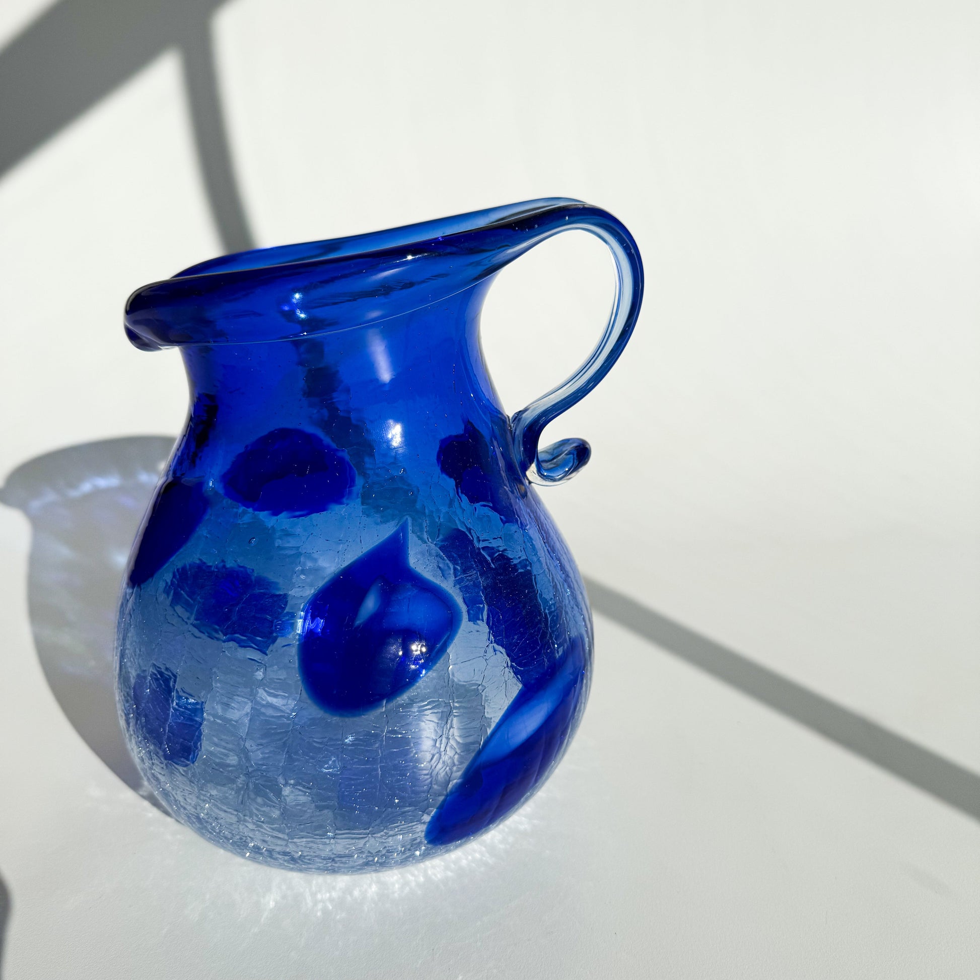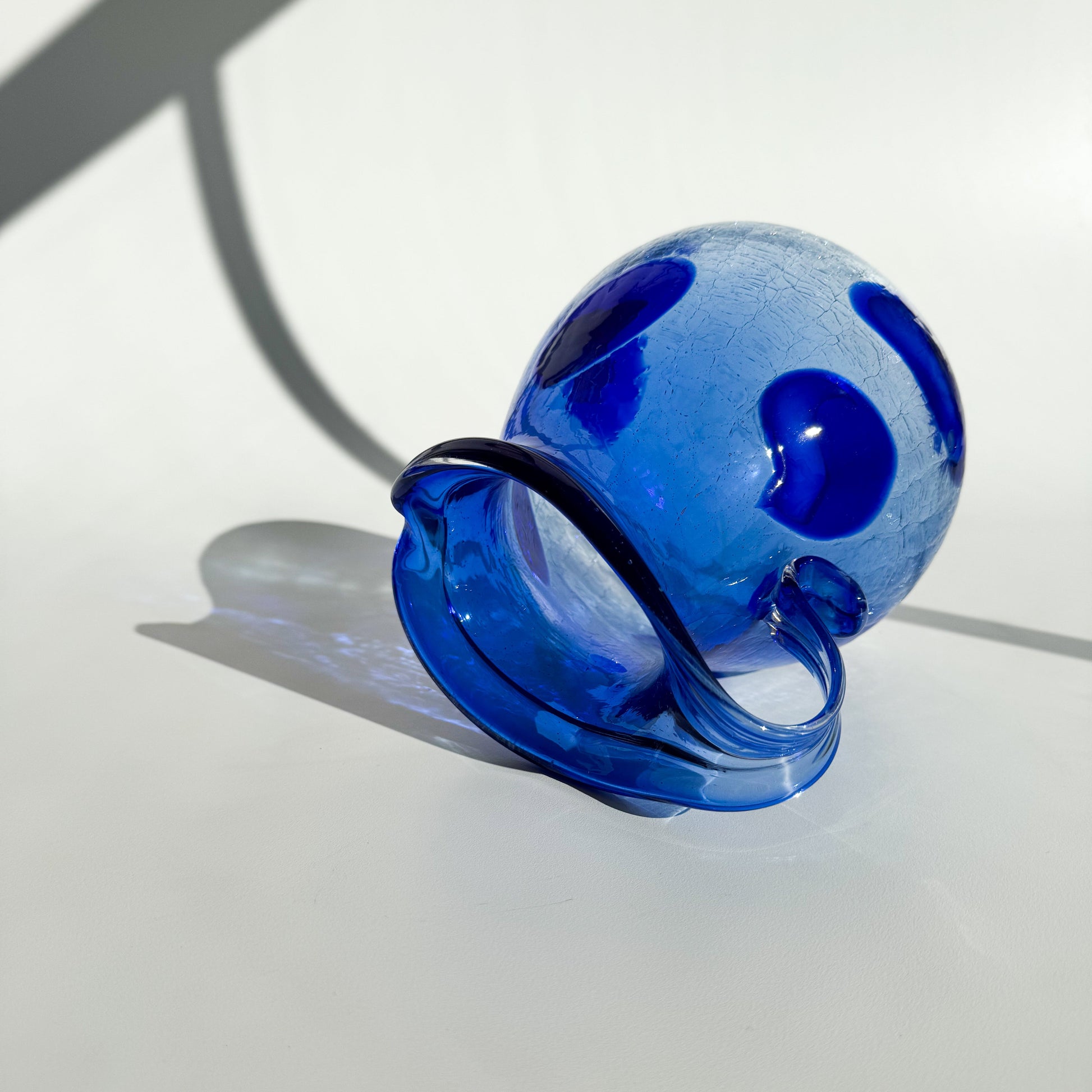 Jarro decorativo em vidro azul com efeito craquelado e aplicação de detalhes em relevo no mesmo tom.