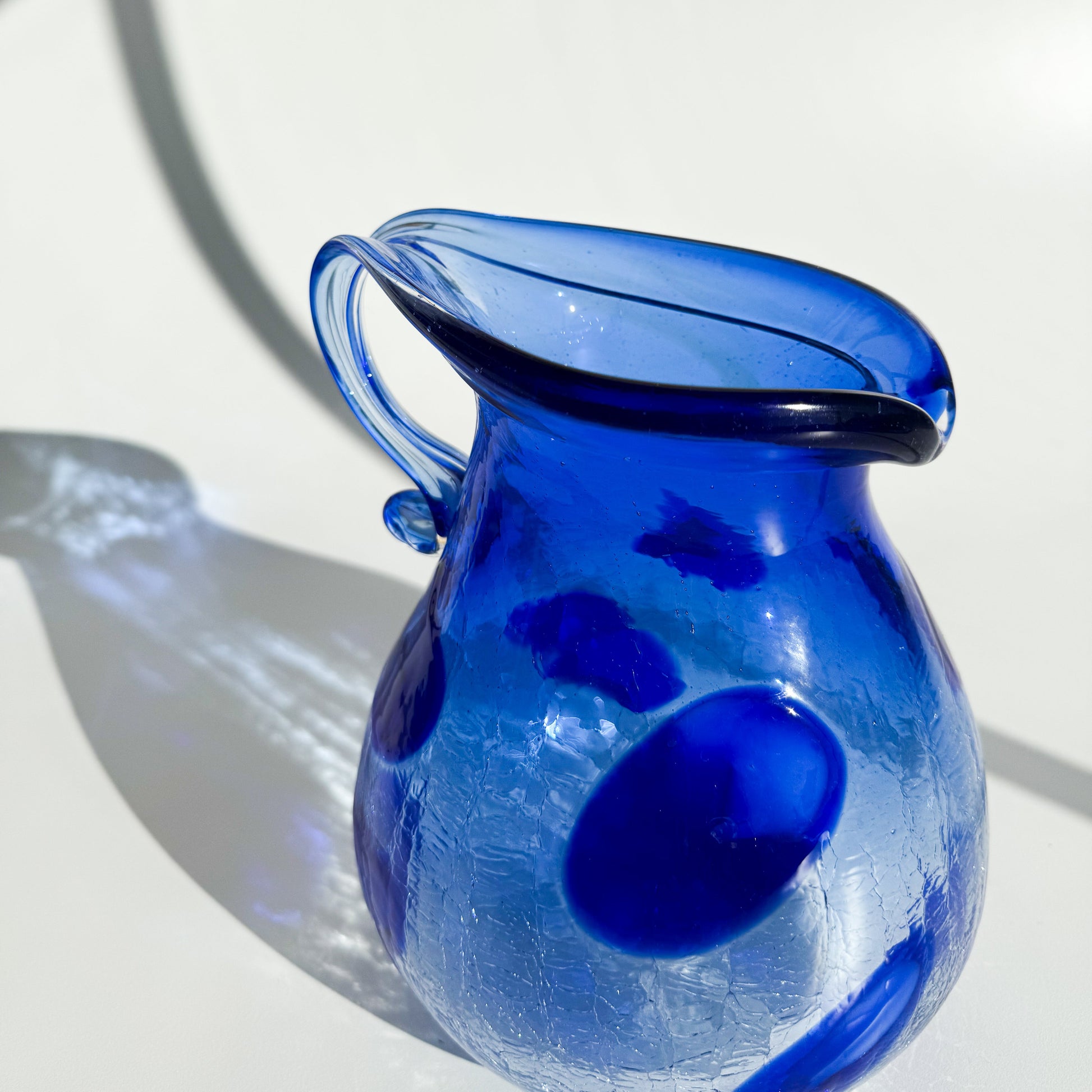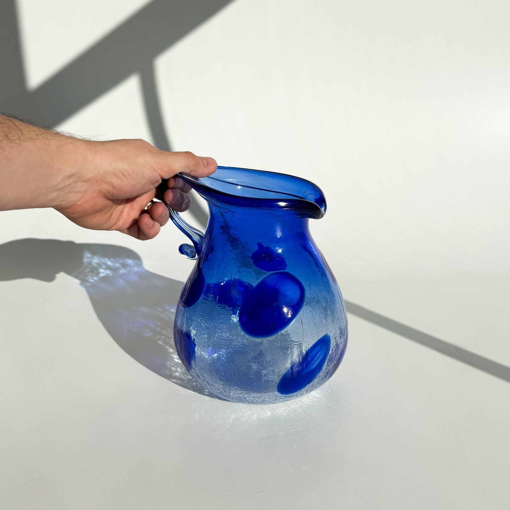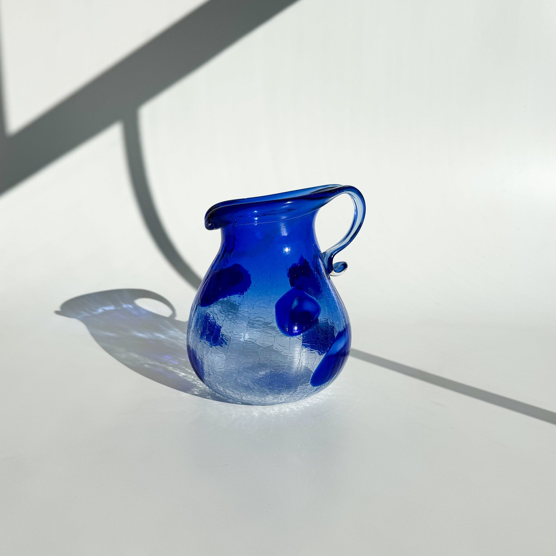 Jarro decorativo em vidro azul com efeito craquelado e aplicação de detalhes em relevo no mesmo tom.