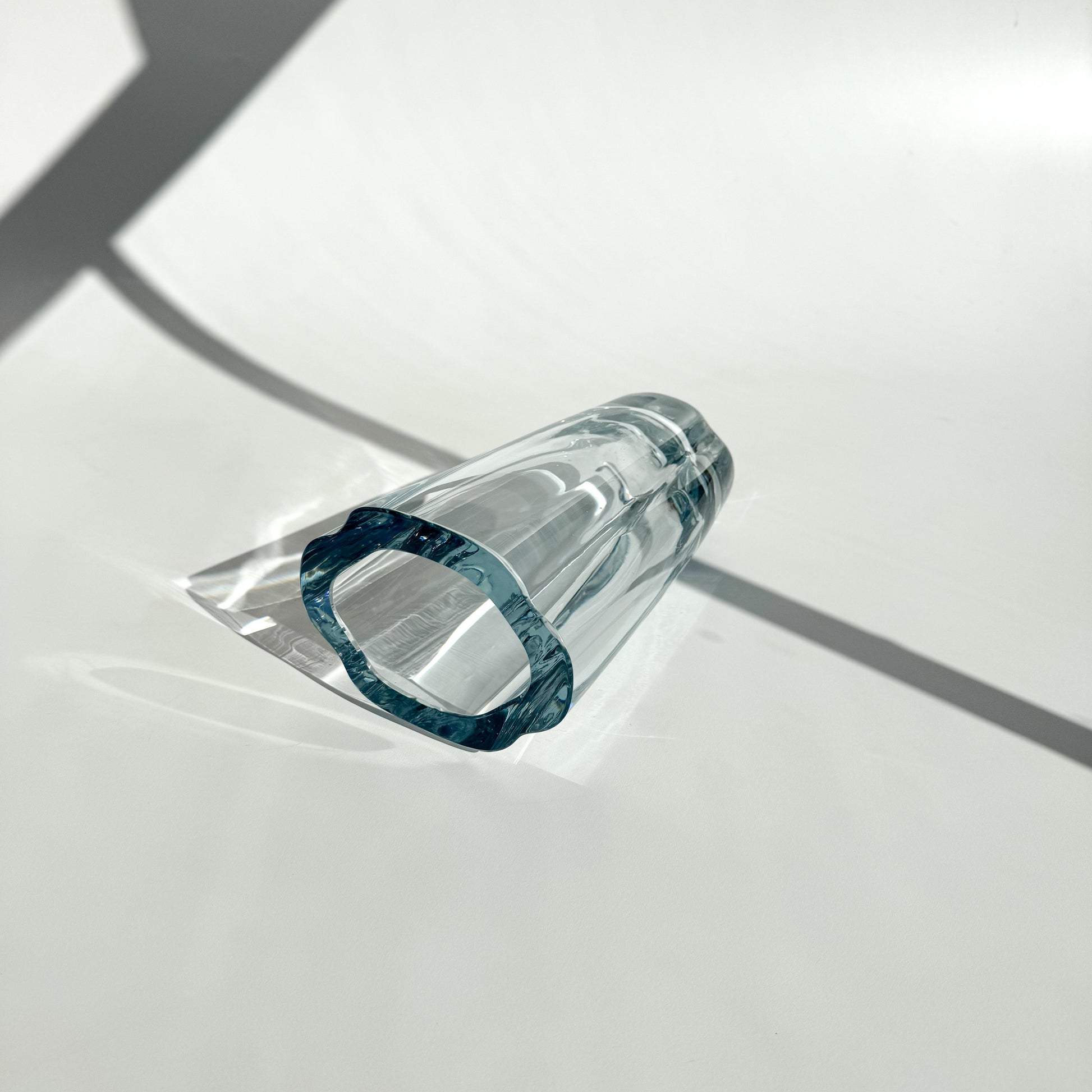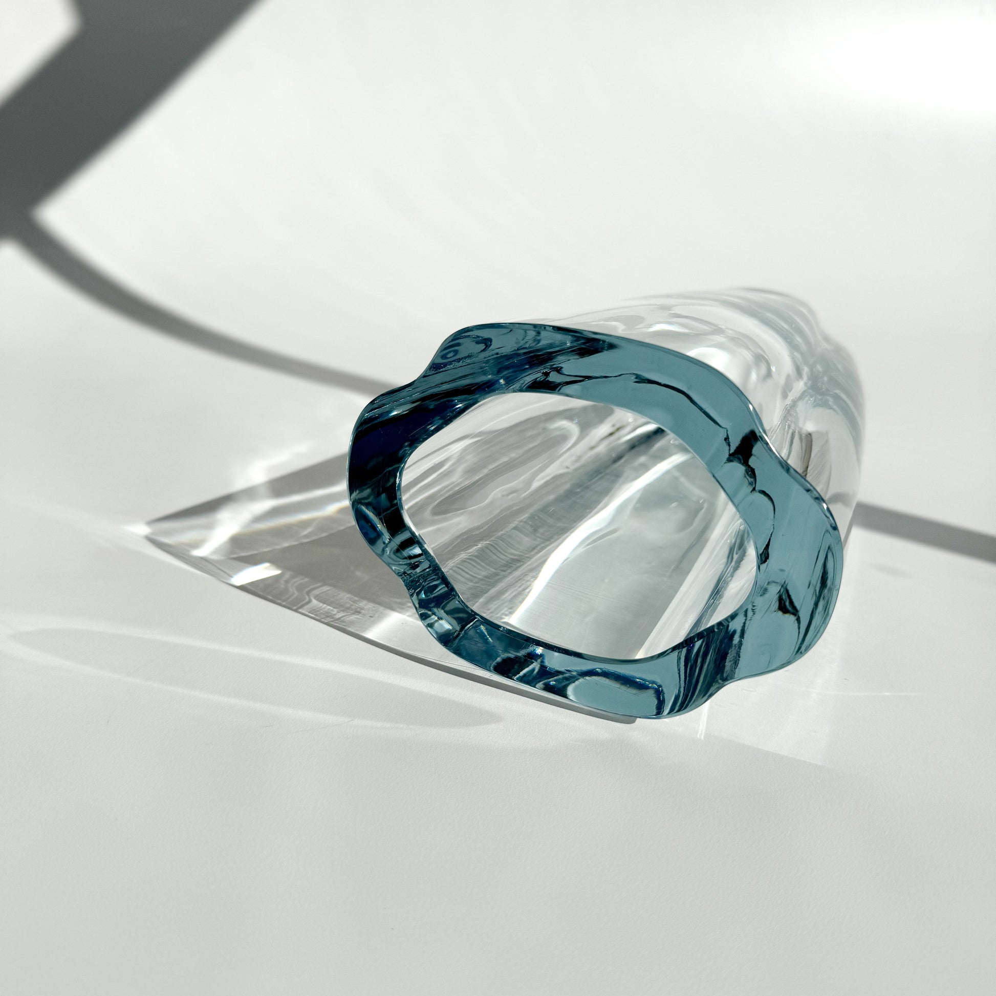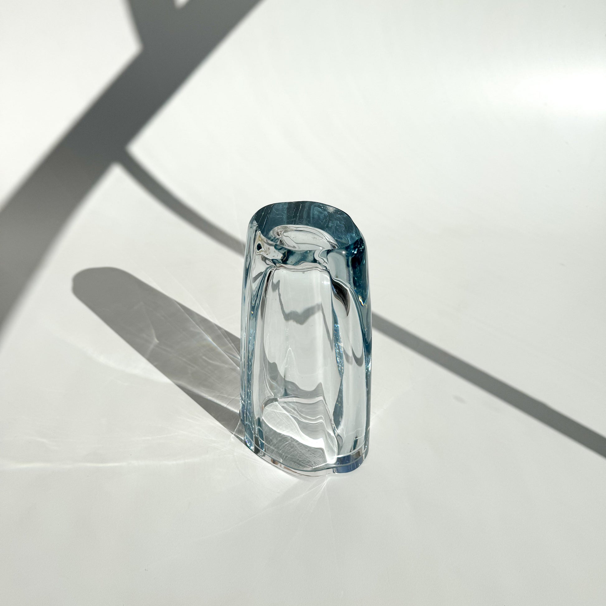 Vaso sueco em vidro espesso e translúcido, com formato orgânico.