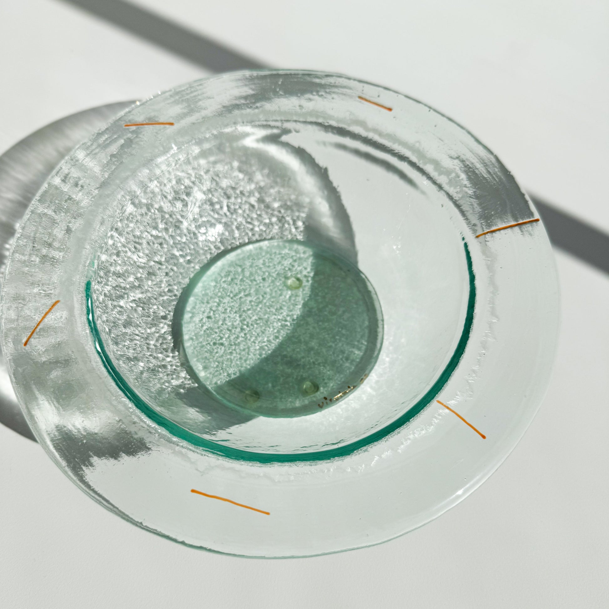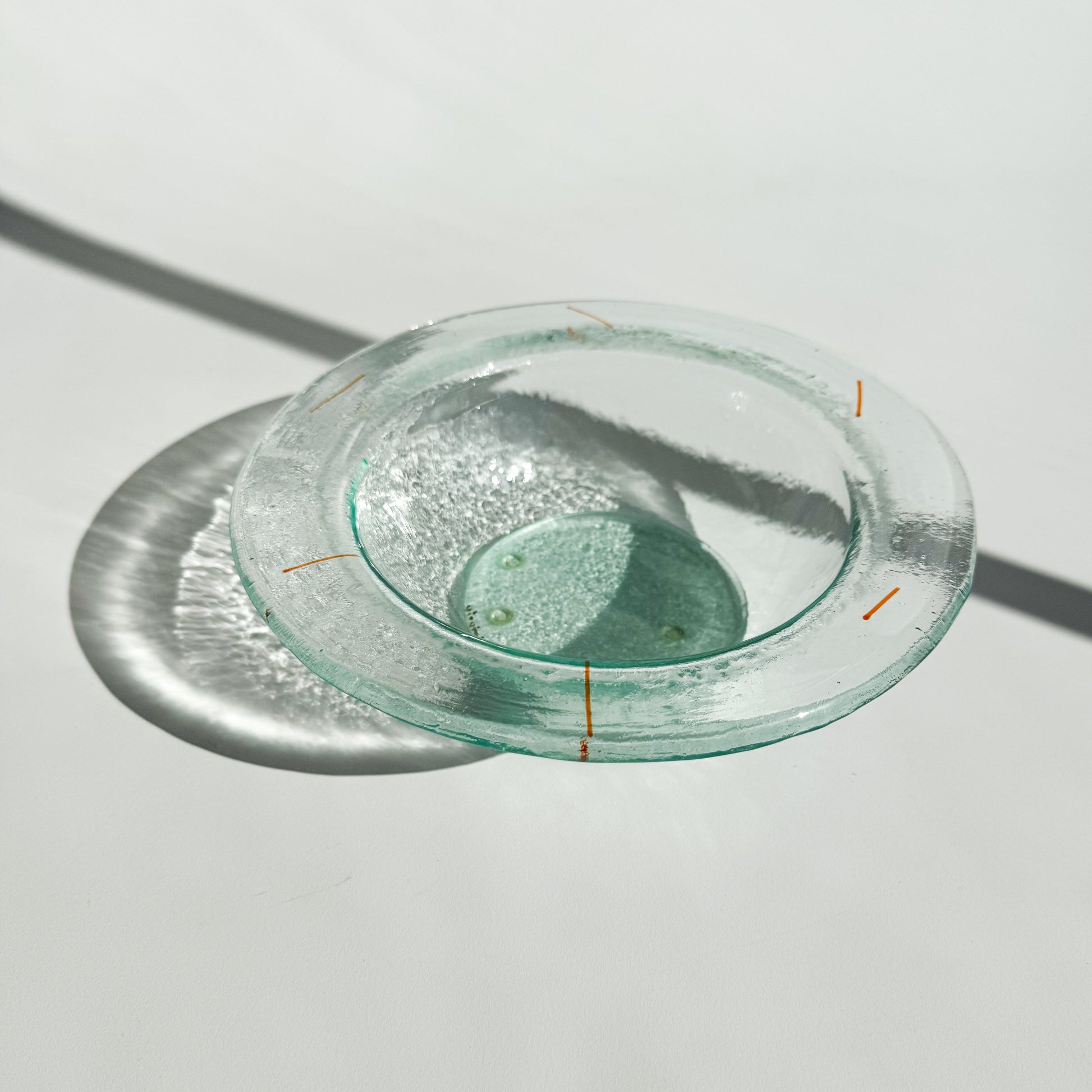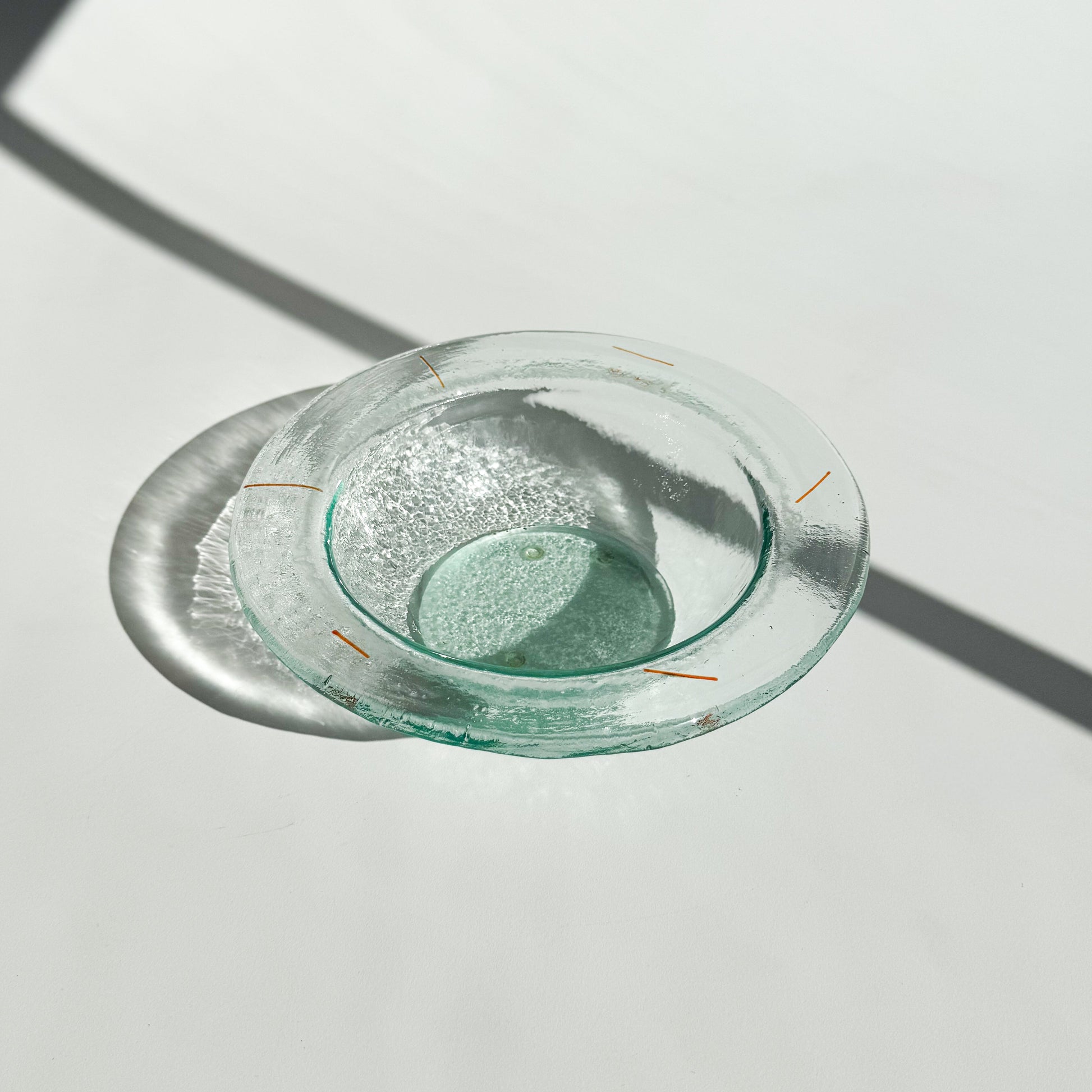 Cinzeiro em vidro reciclado translúcido com detalhes laranjas.