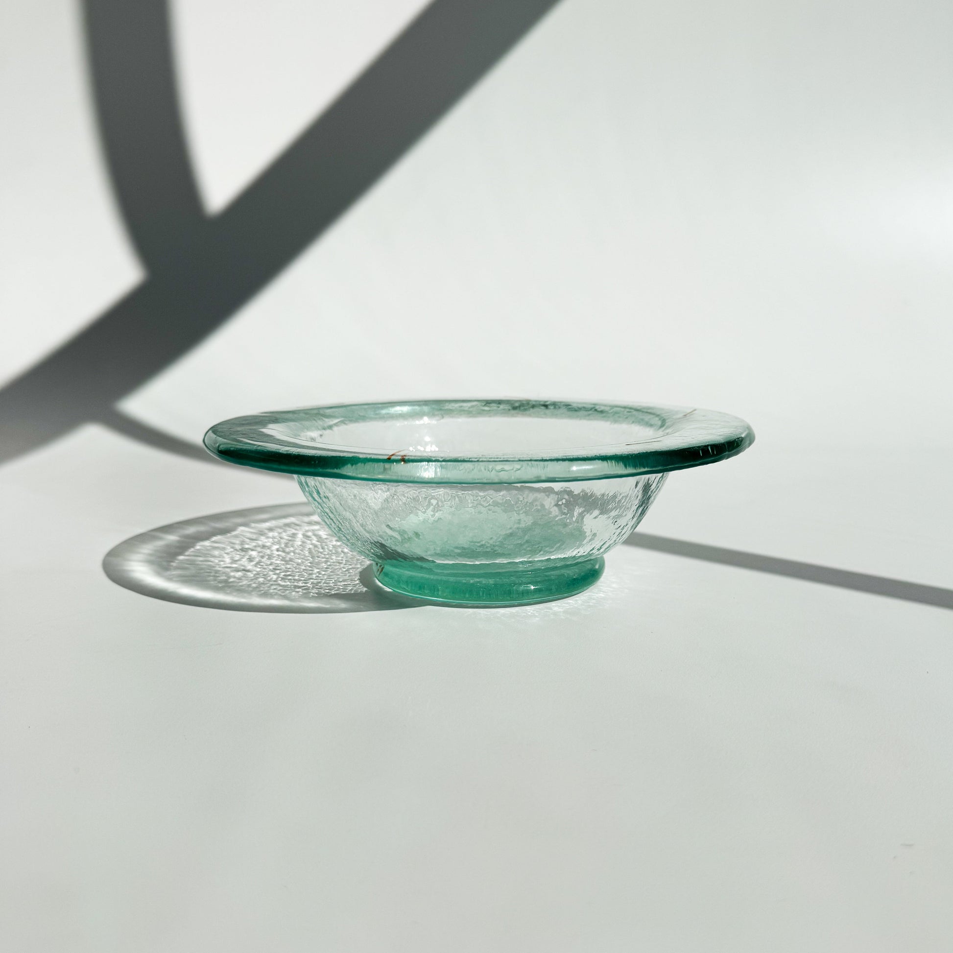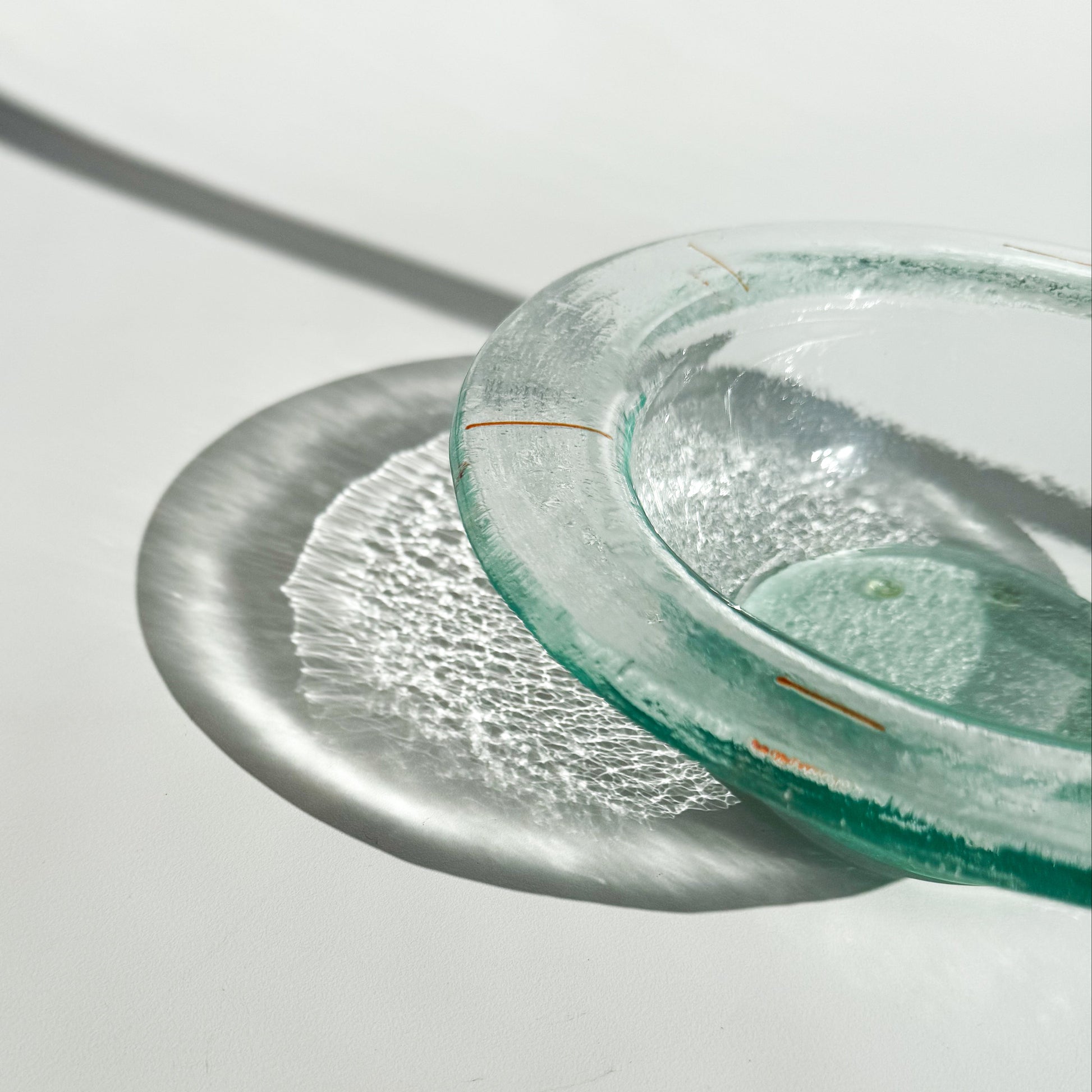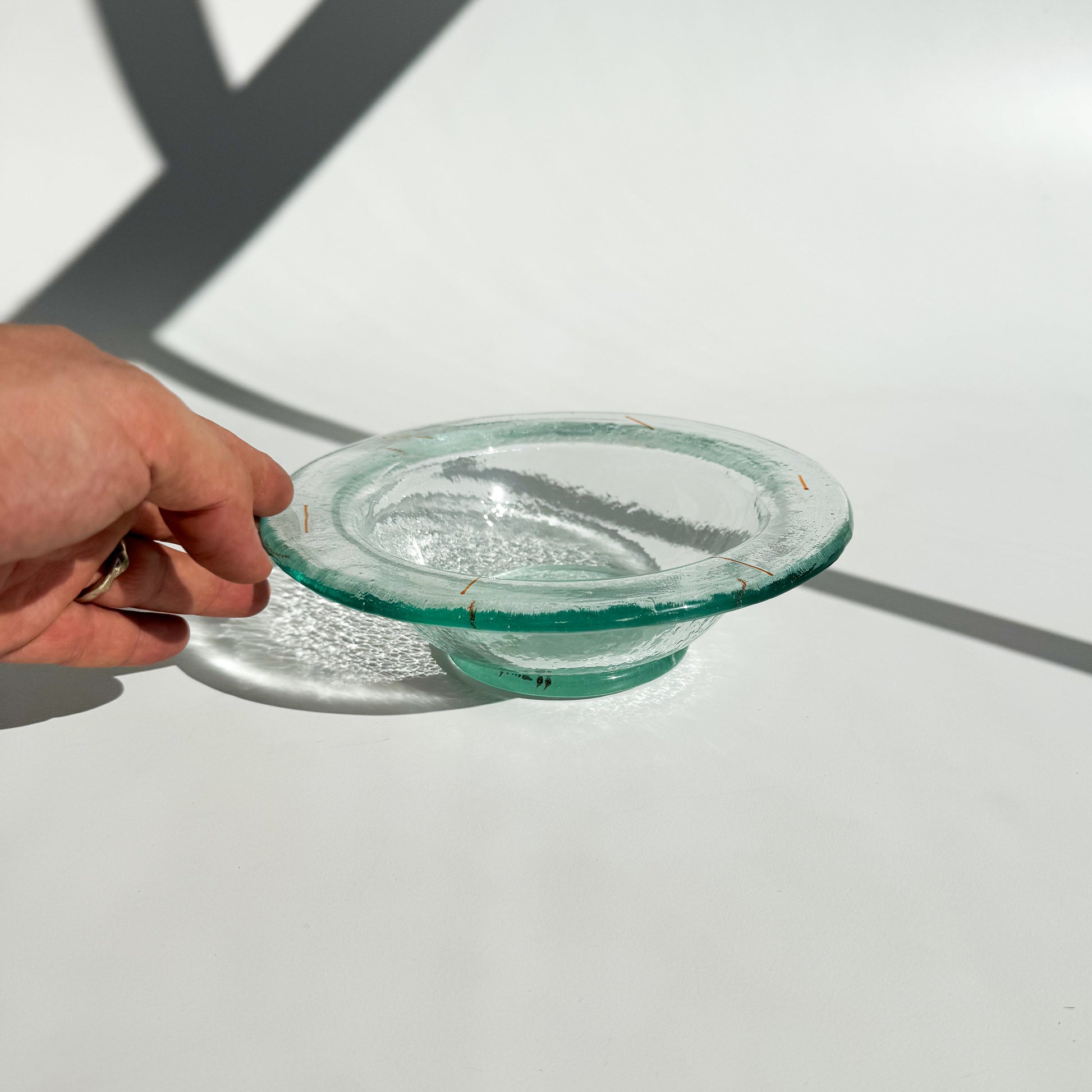 Cinzeiro em vidro reciclado translúcido com detalhes laranjas.