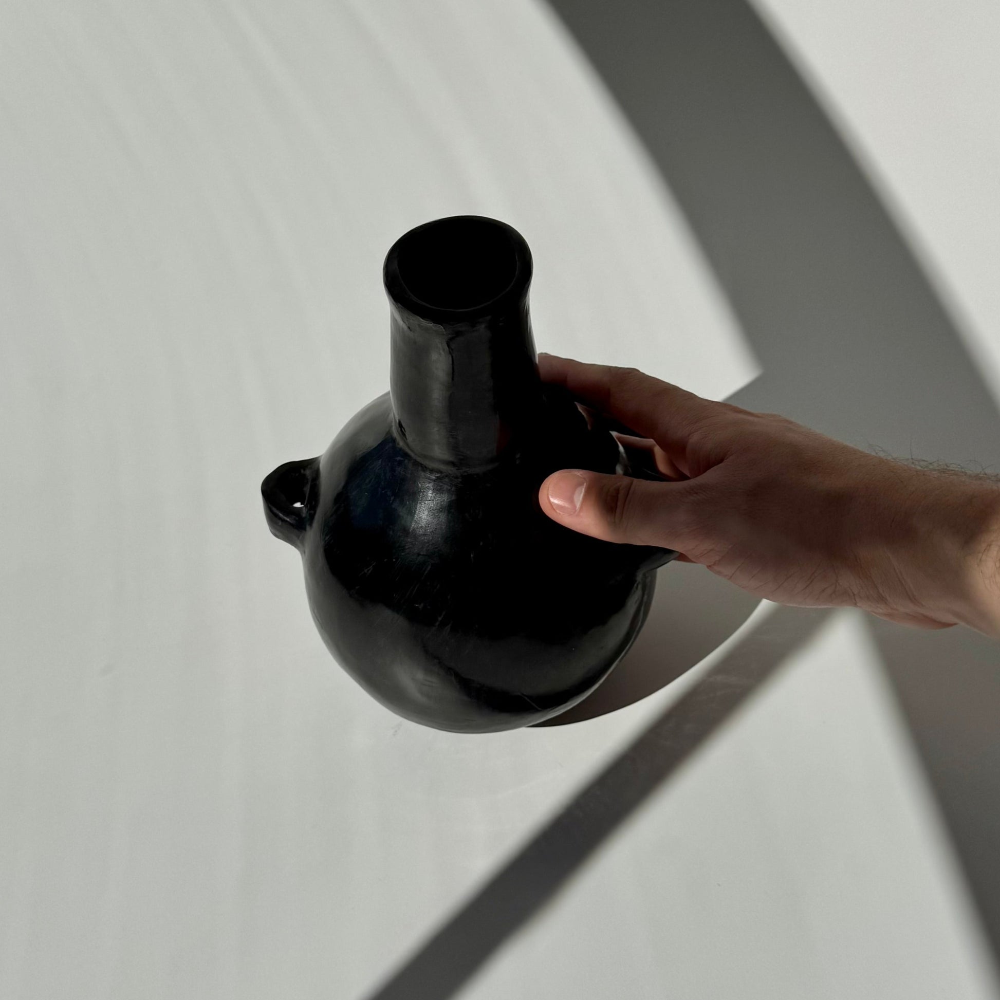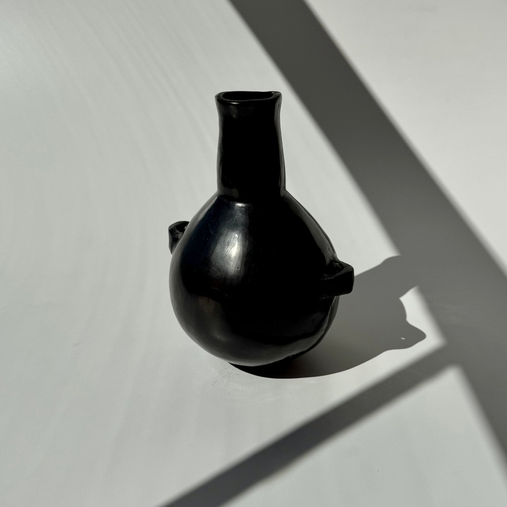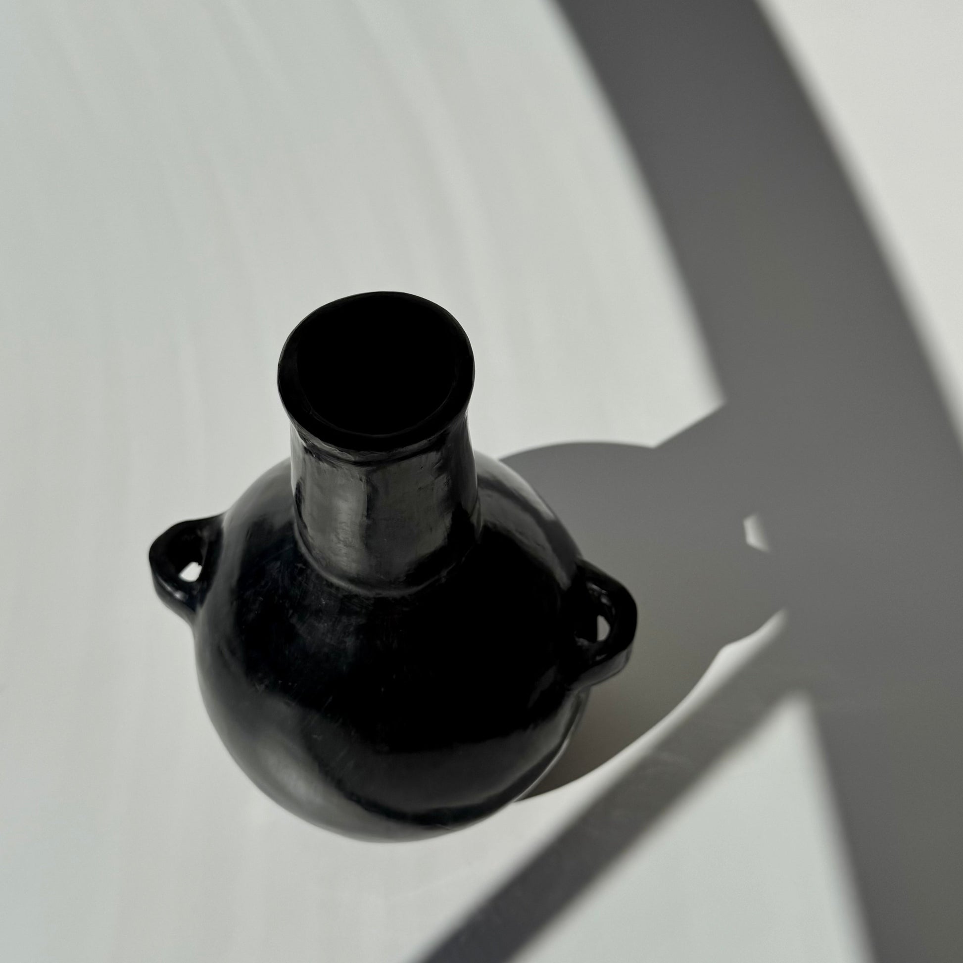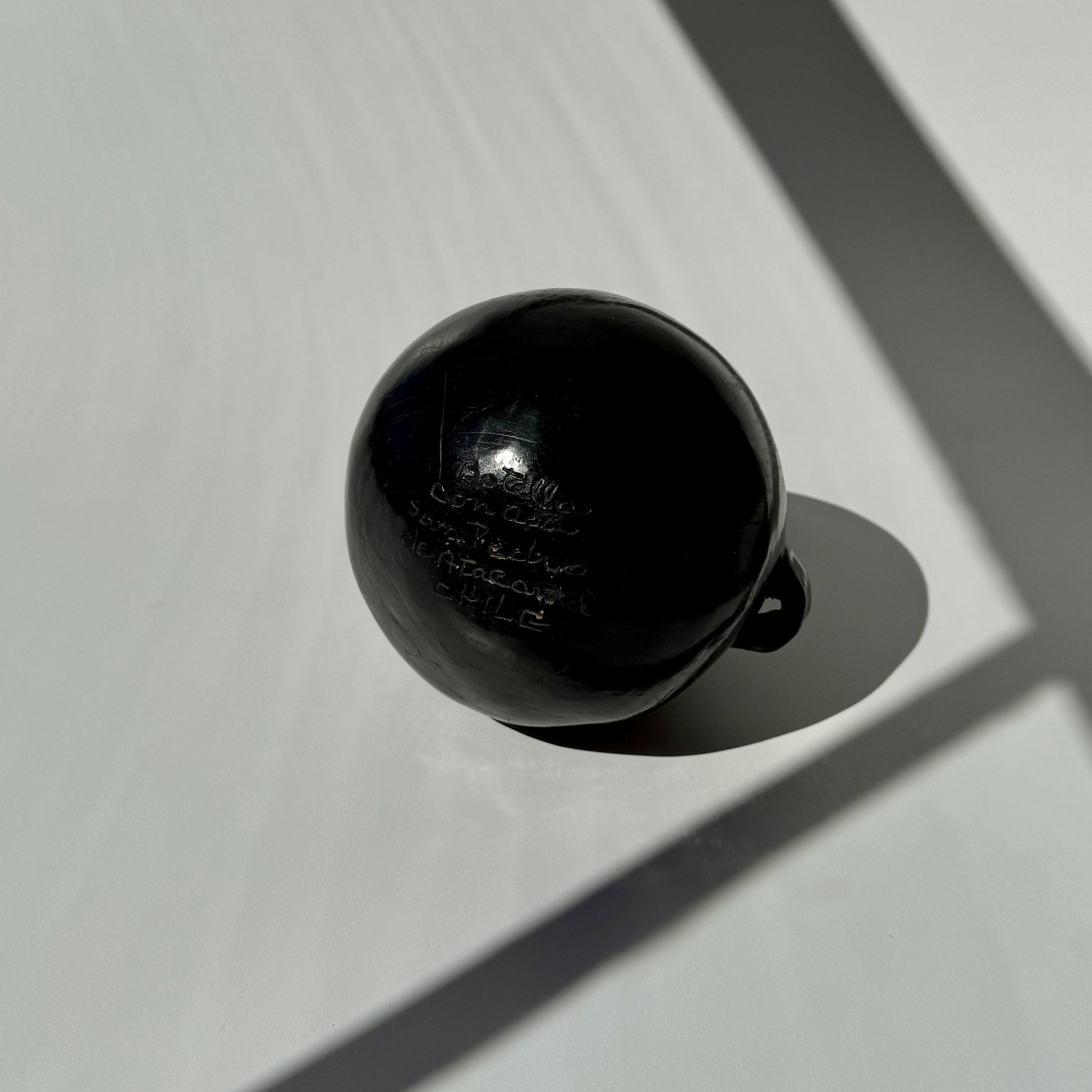 A peça é uma “Botella Con Asas” de cerâmica negra, originária da região de Vallenar, no Atacama.