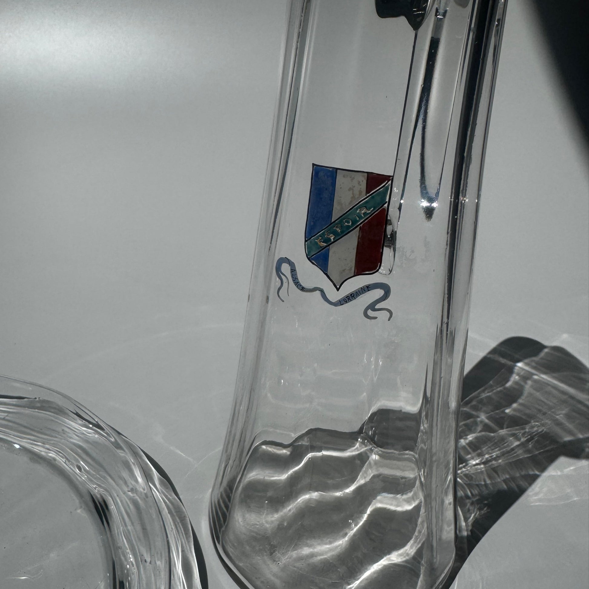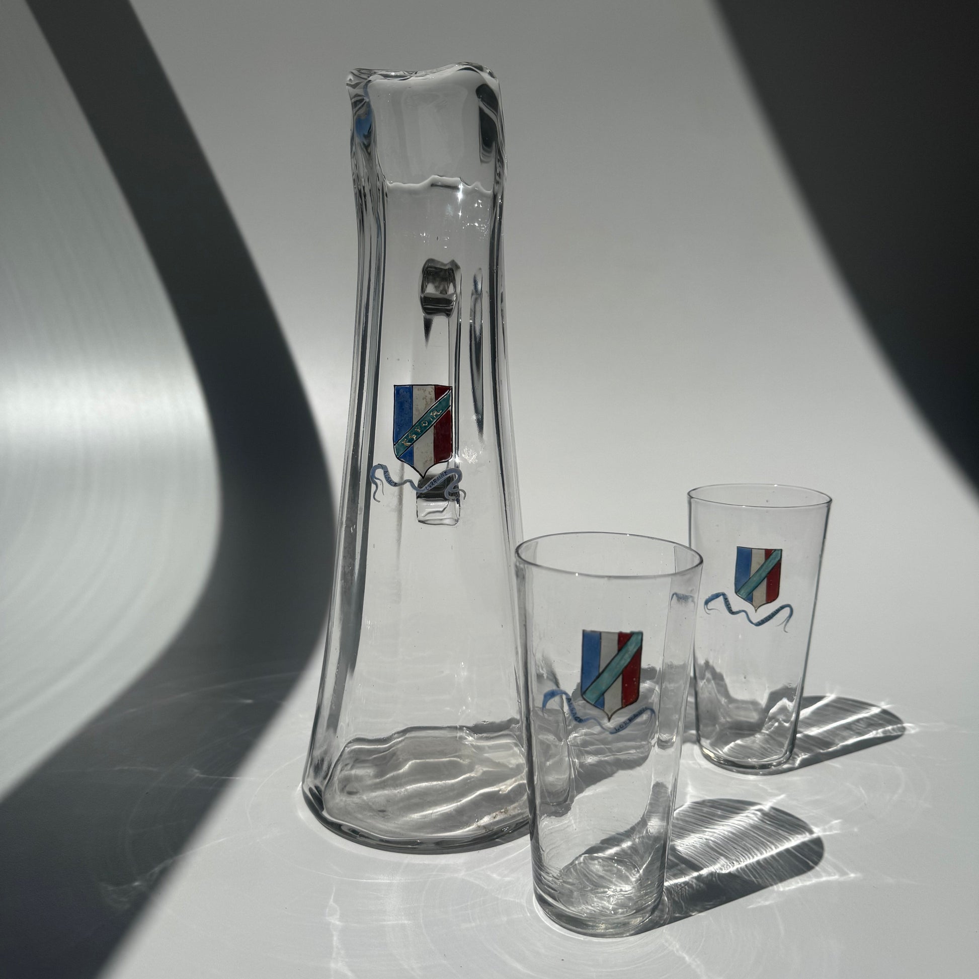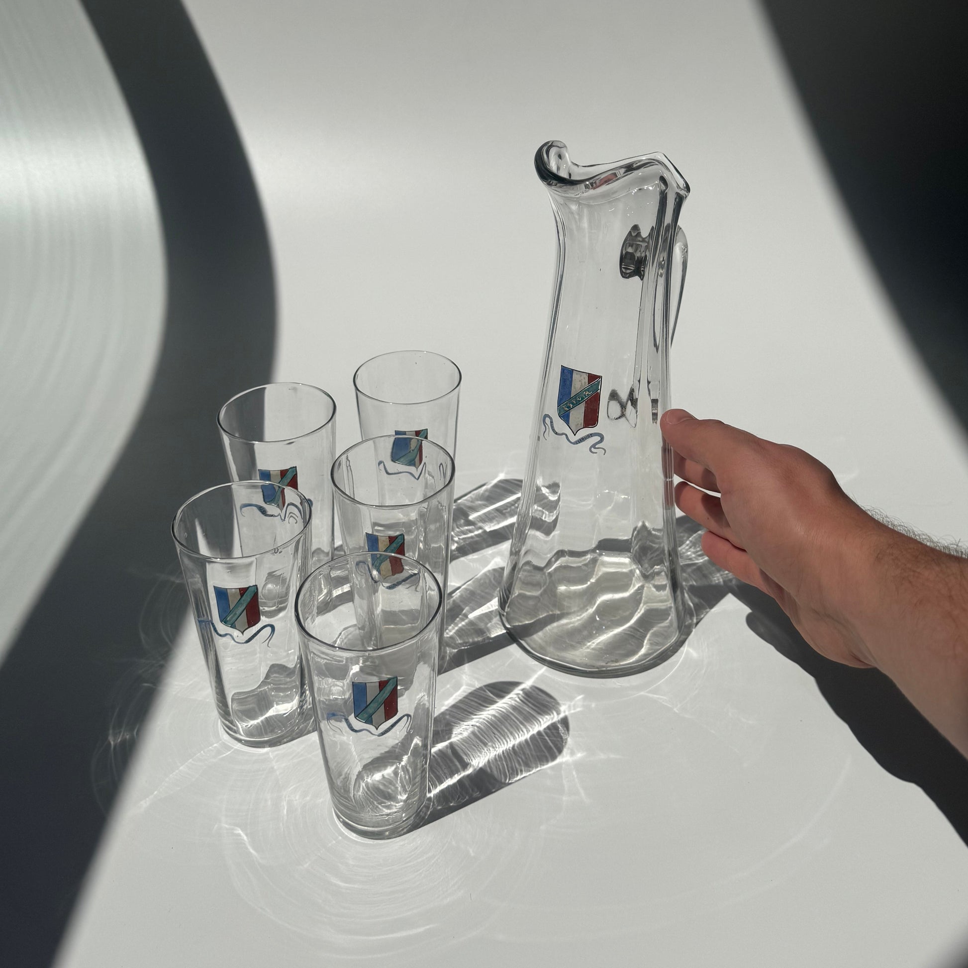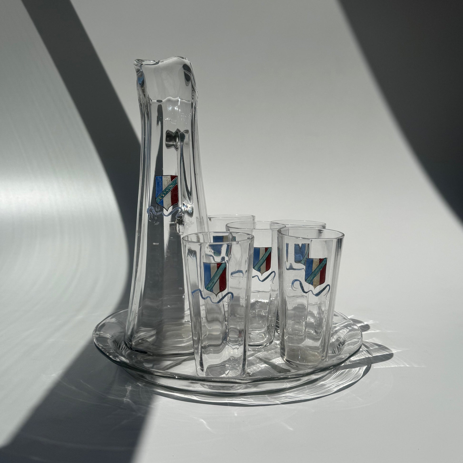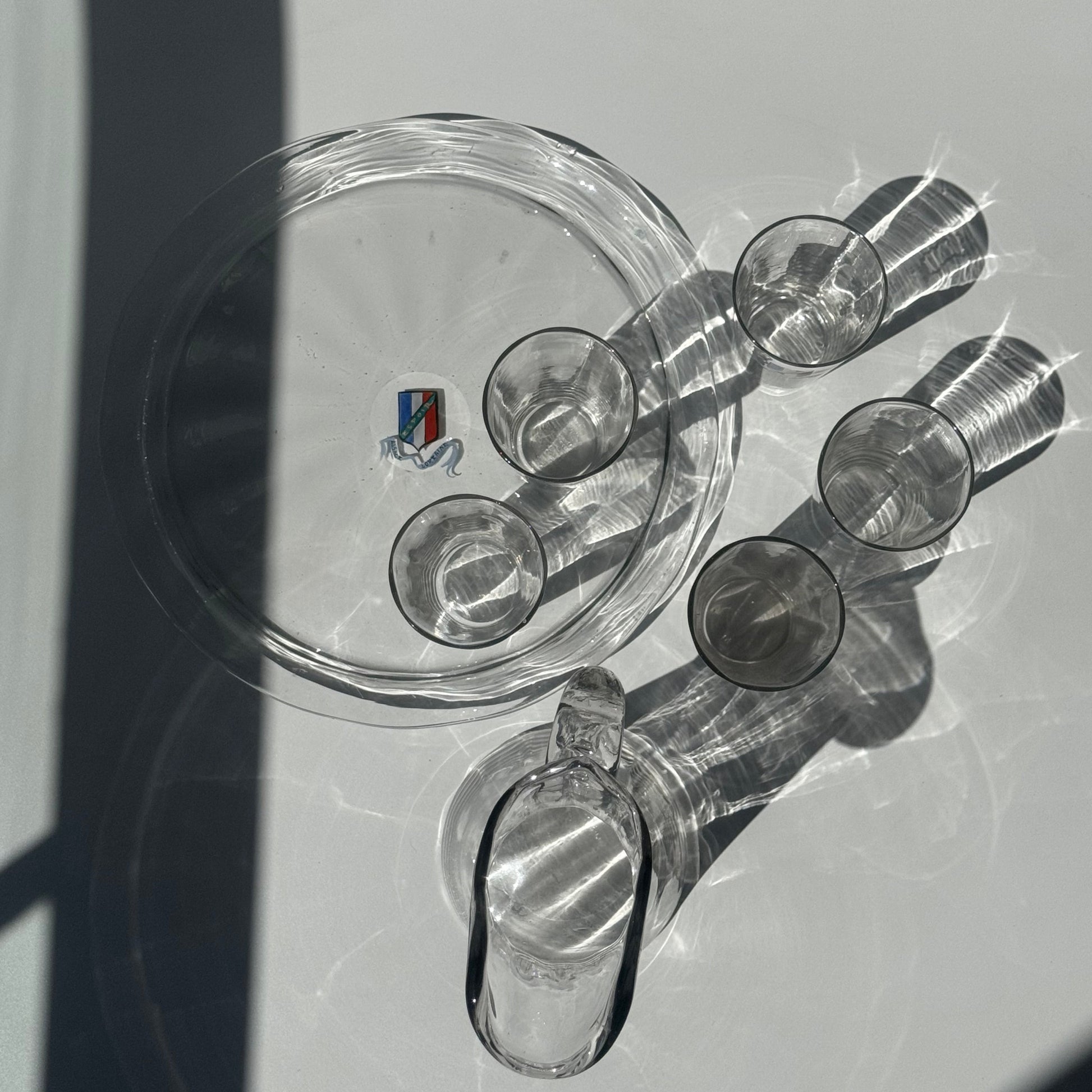 Conjunto com 5 copos, jarra e bandeja em vidro.