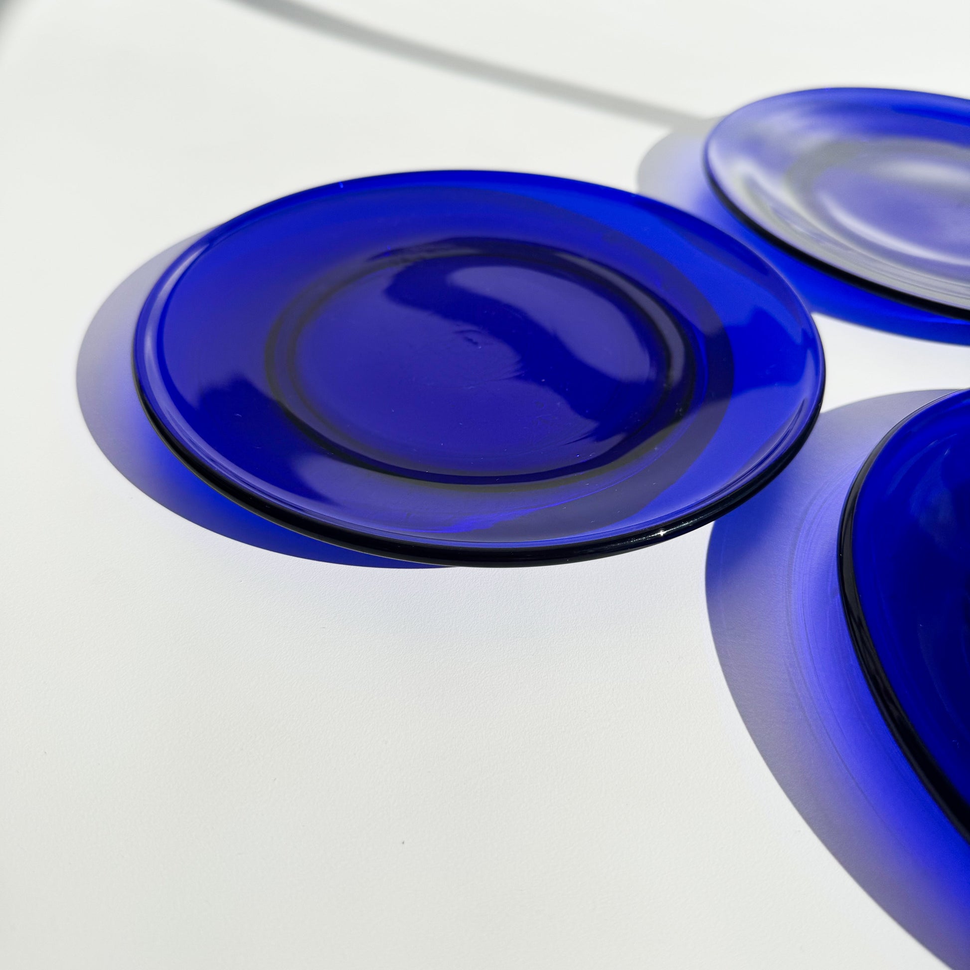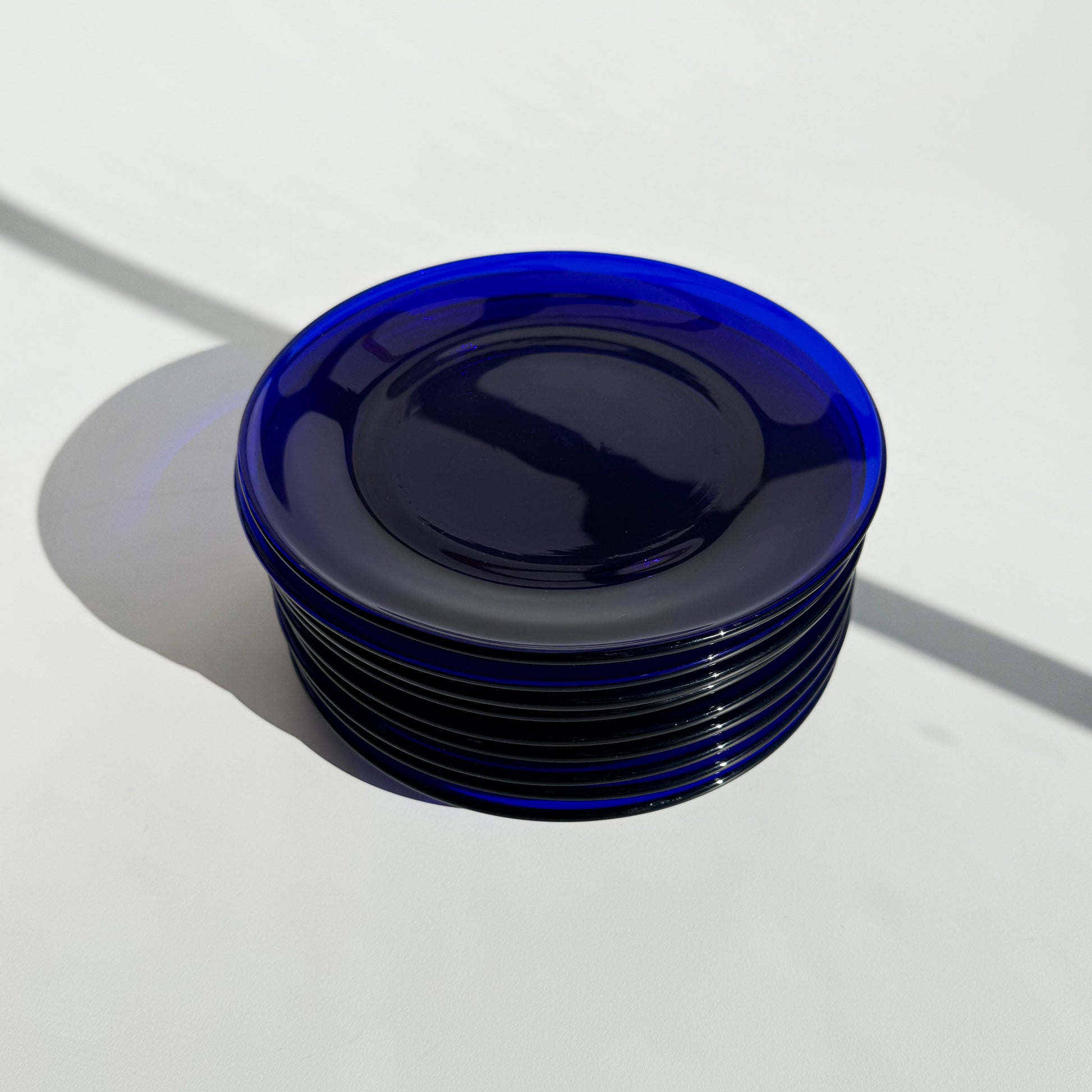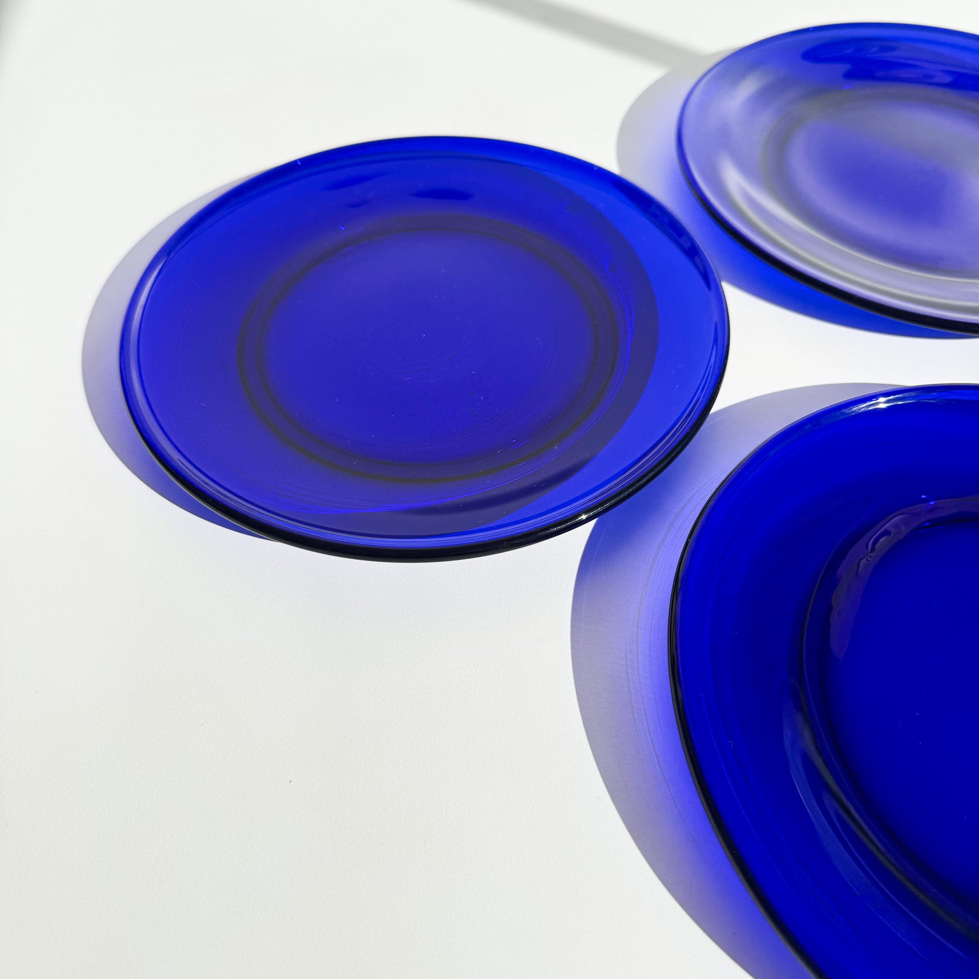 Conjunto com onze pratos rasos, grandes, de vidro azul.