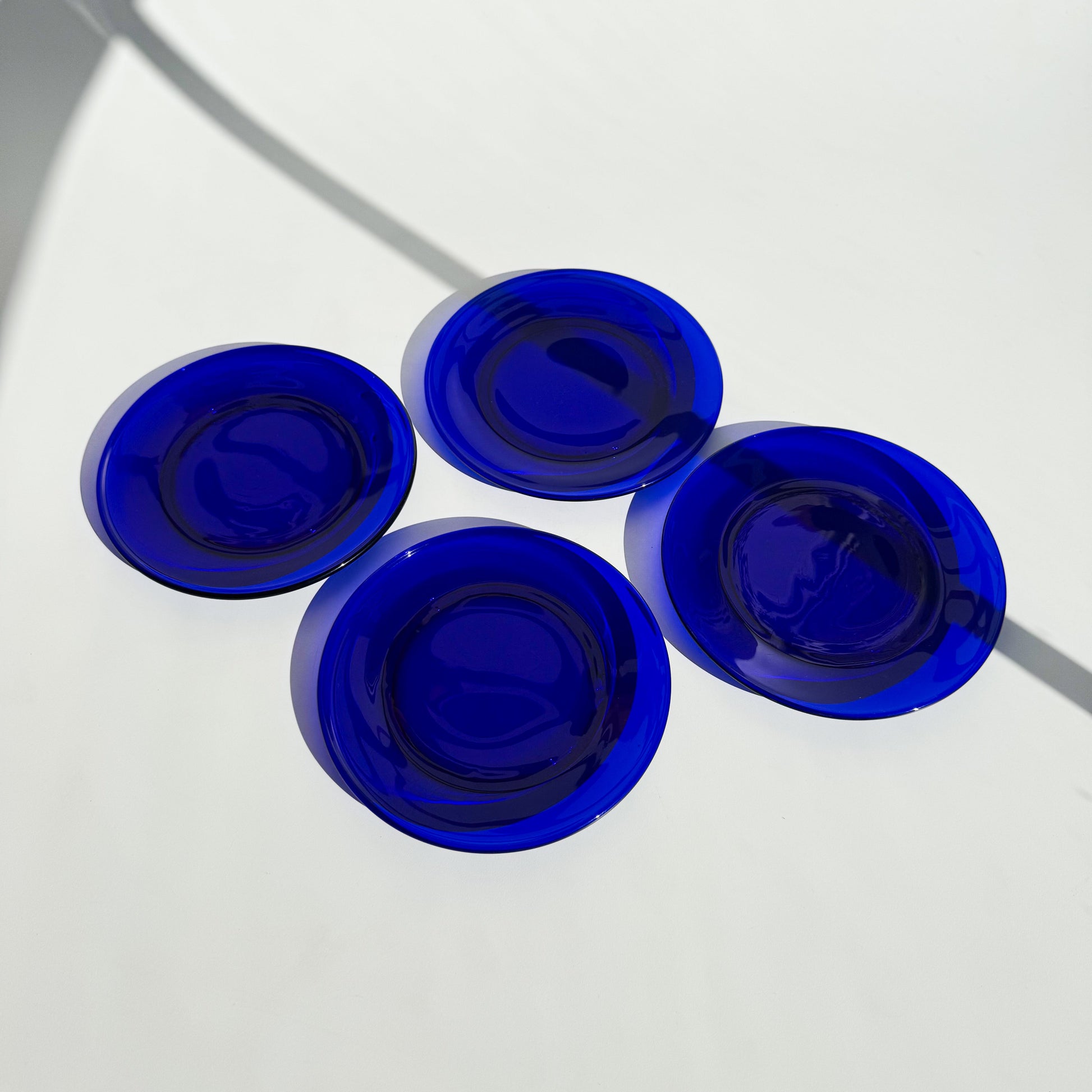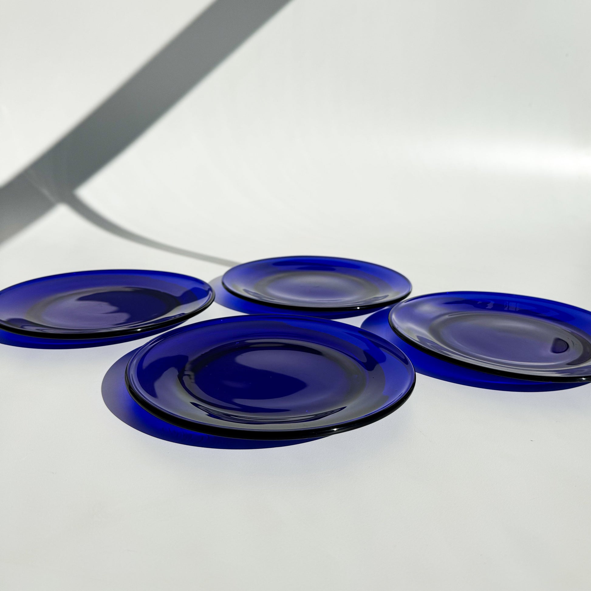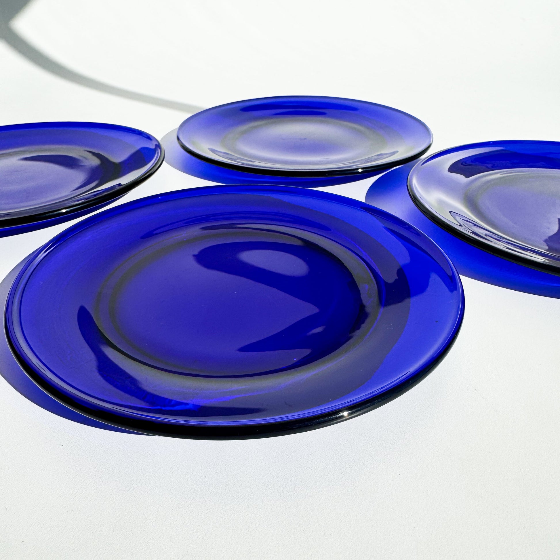 Conjunto com onze pratos rasos, grandes, de vidro azul.