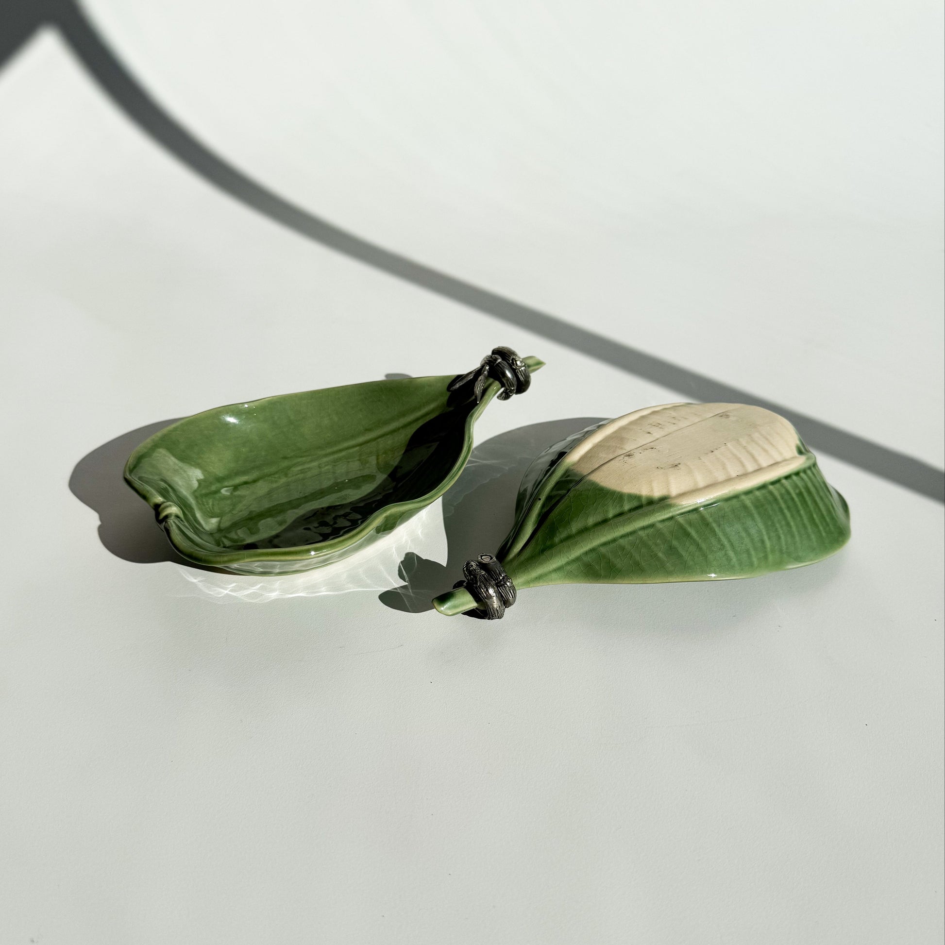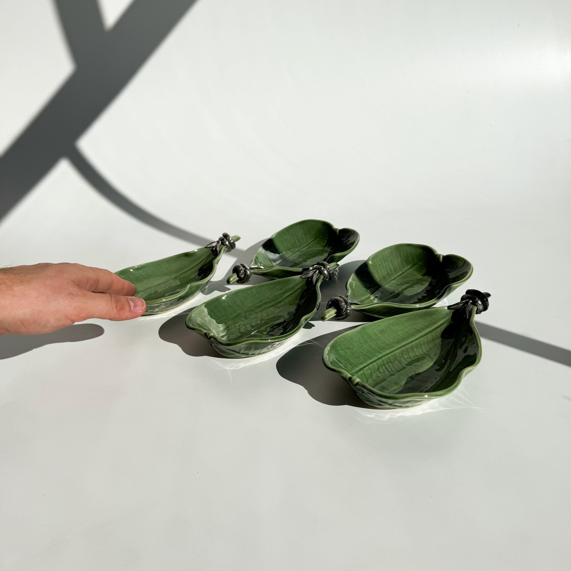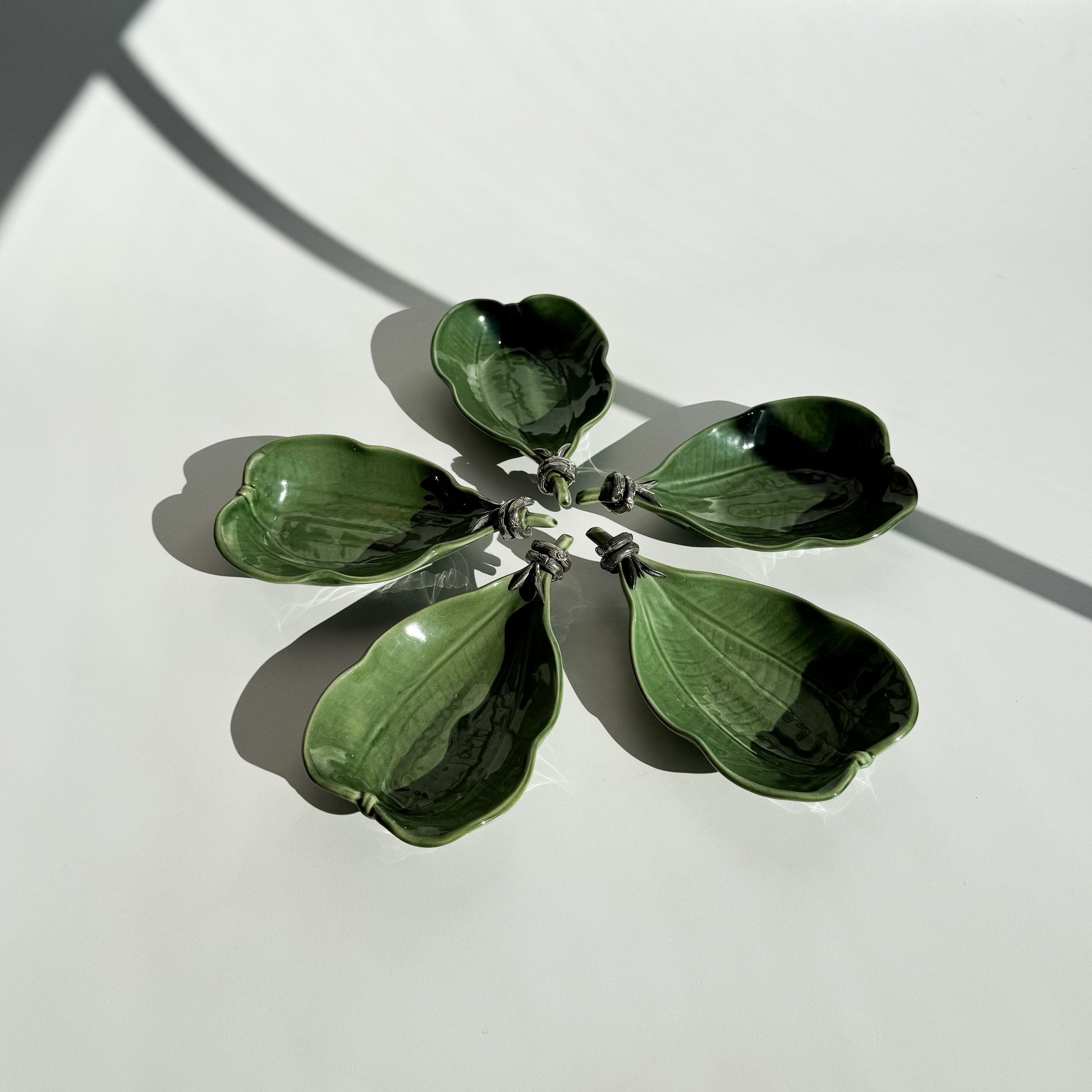 Conjunto de cinco pratos de sobremesa em formato de folha, produzidos em cerâmica com detalhes em metal.