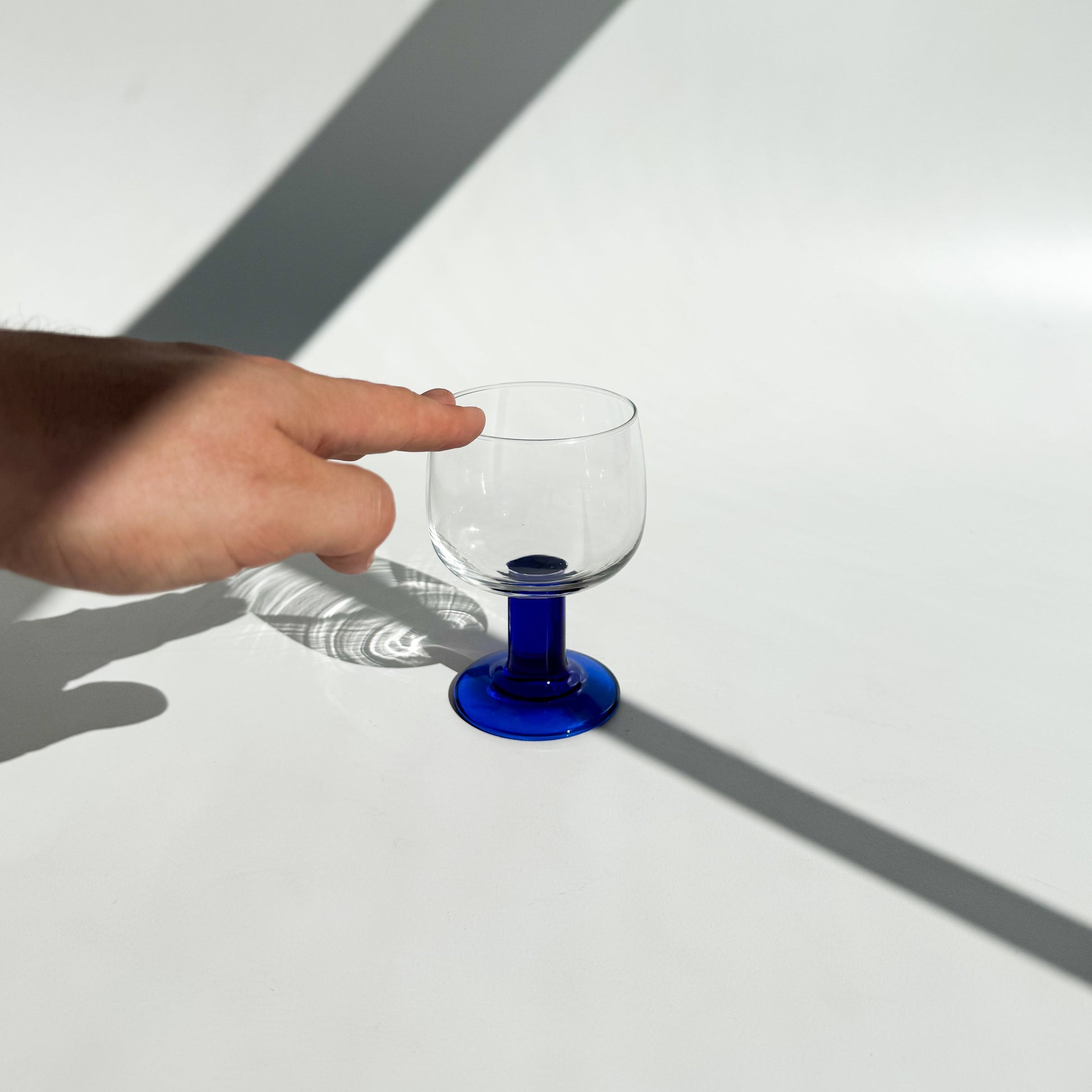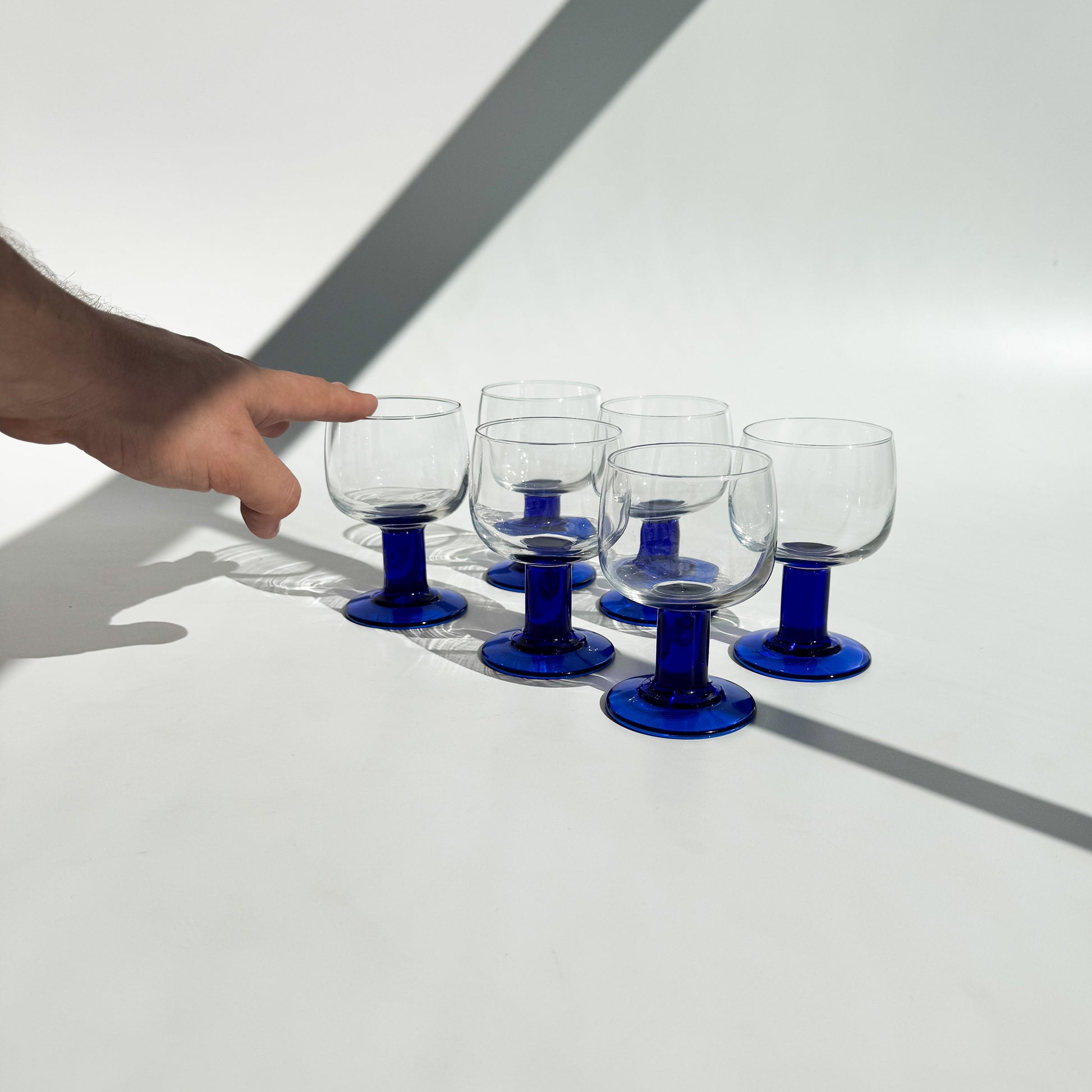 Conjunto de seis taças de vinho em demi-cristal translúcido com base azul.