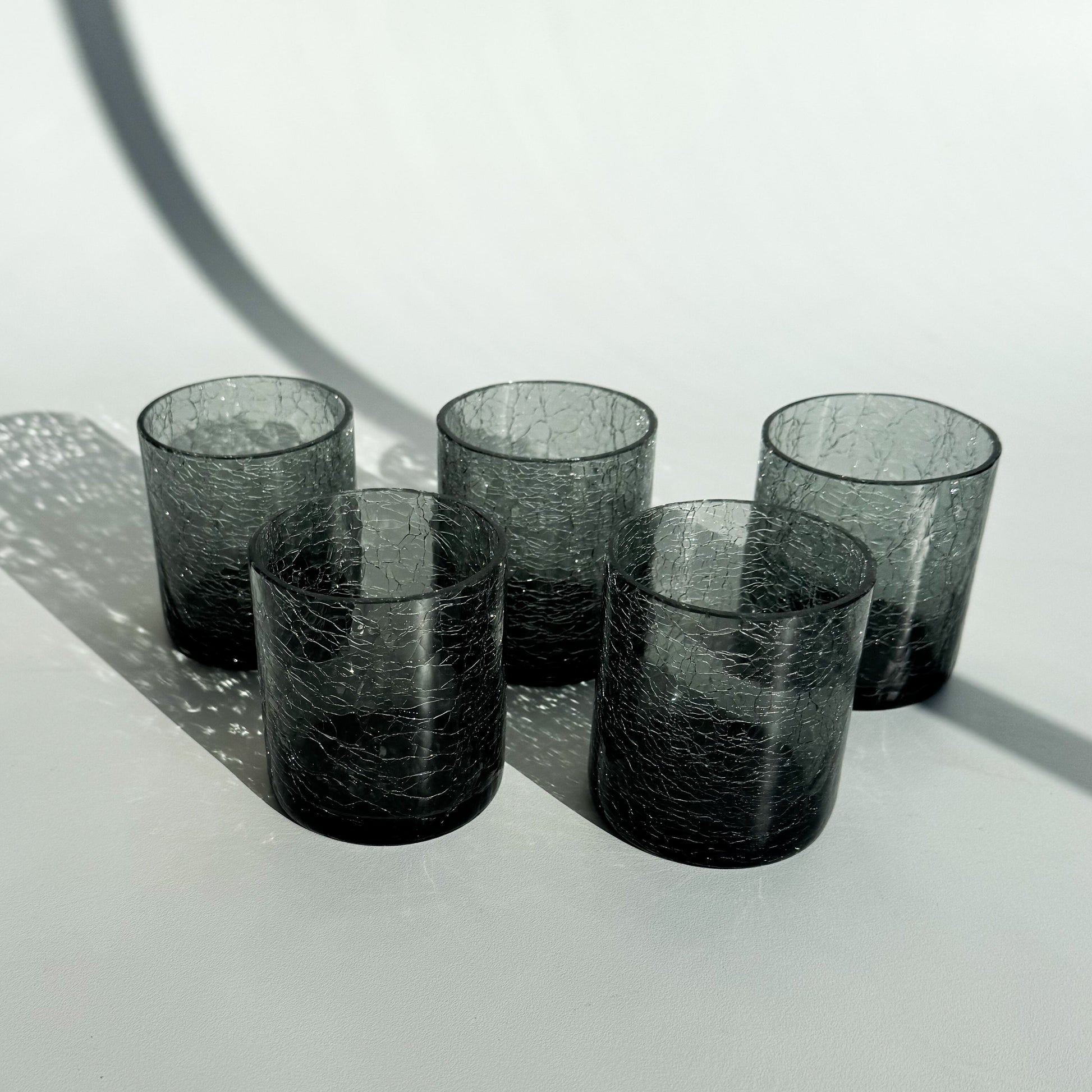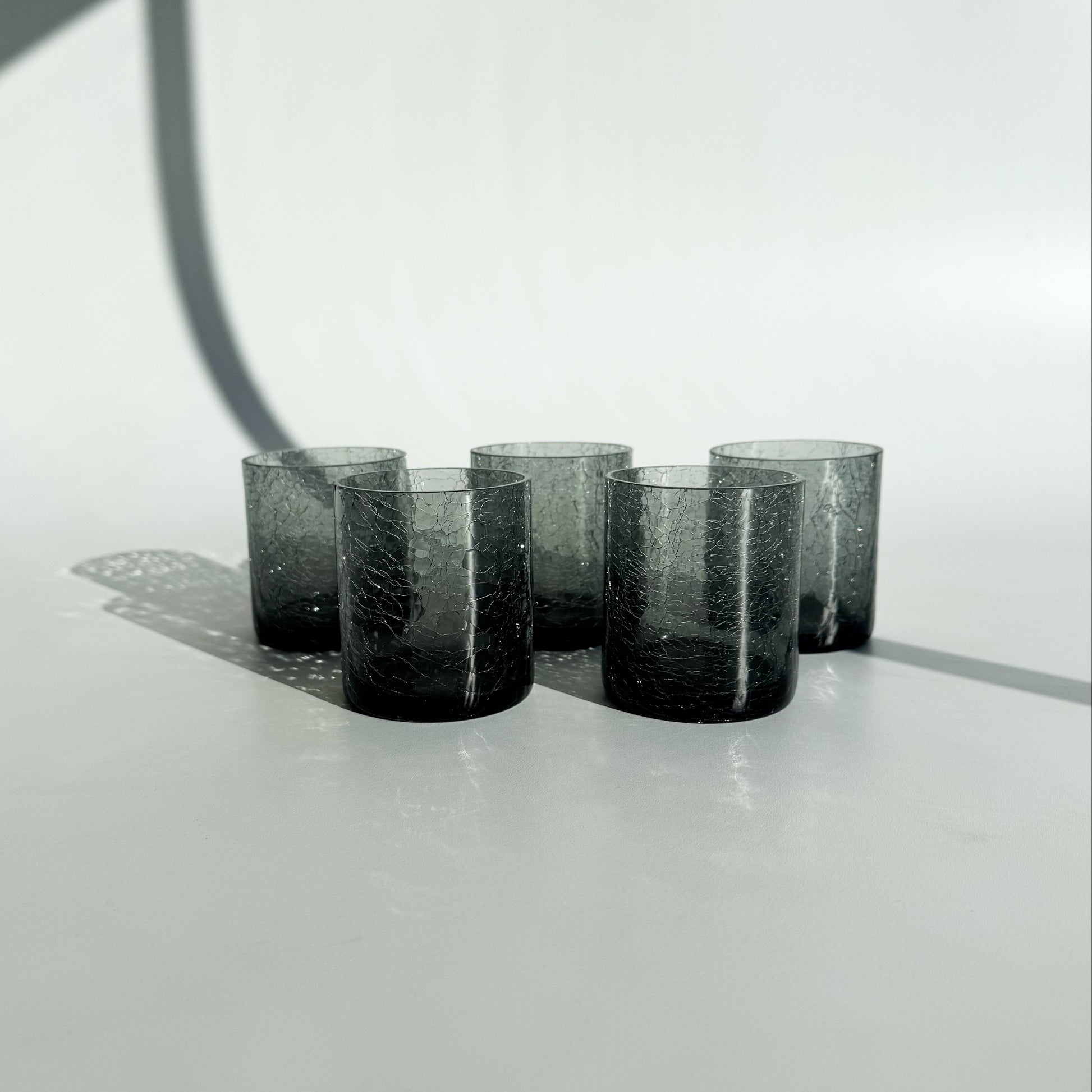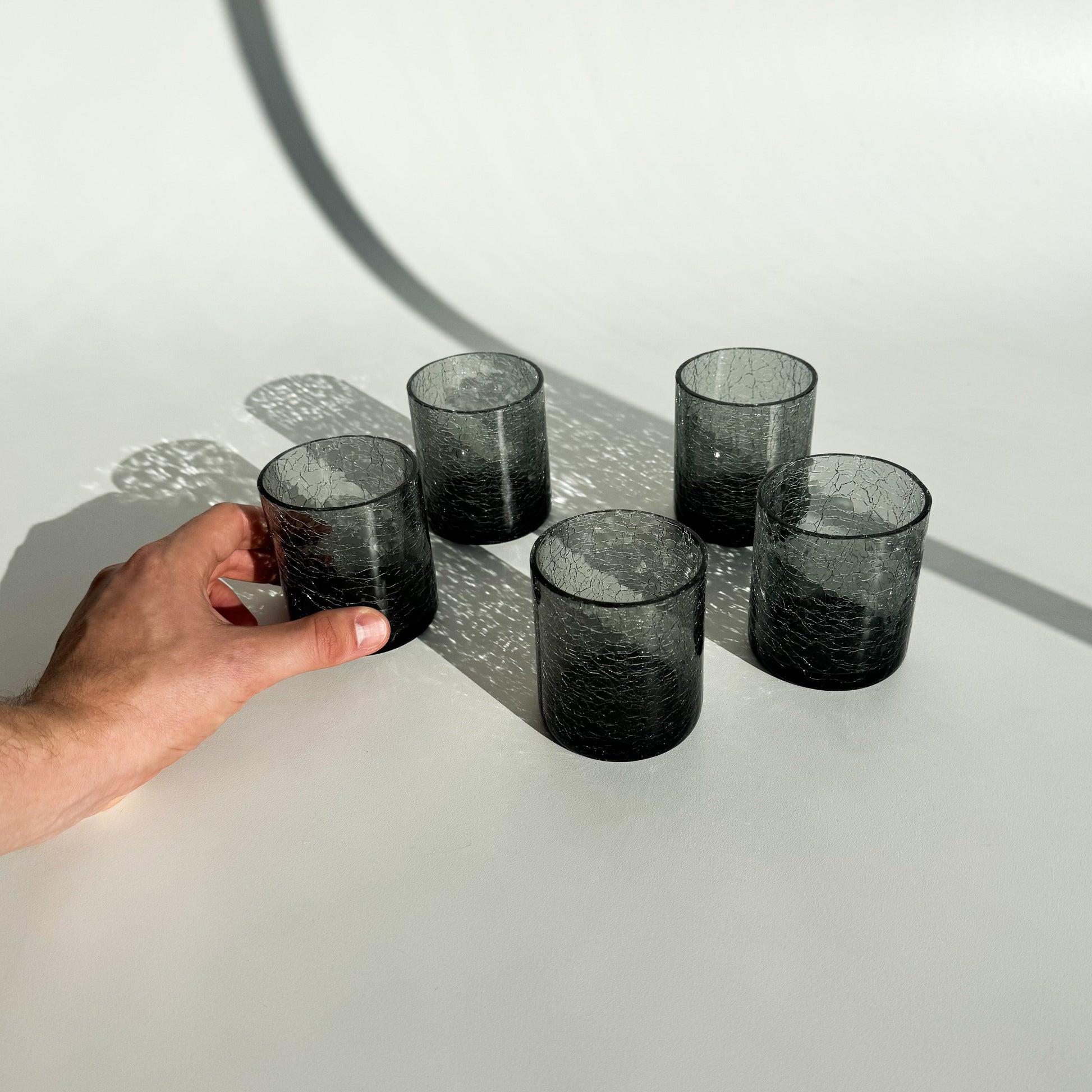 Conjunto com 5 copos em vidro com efeito craquelado e tonalidade cinza-fumê.