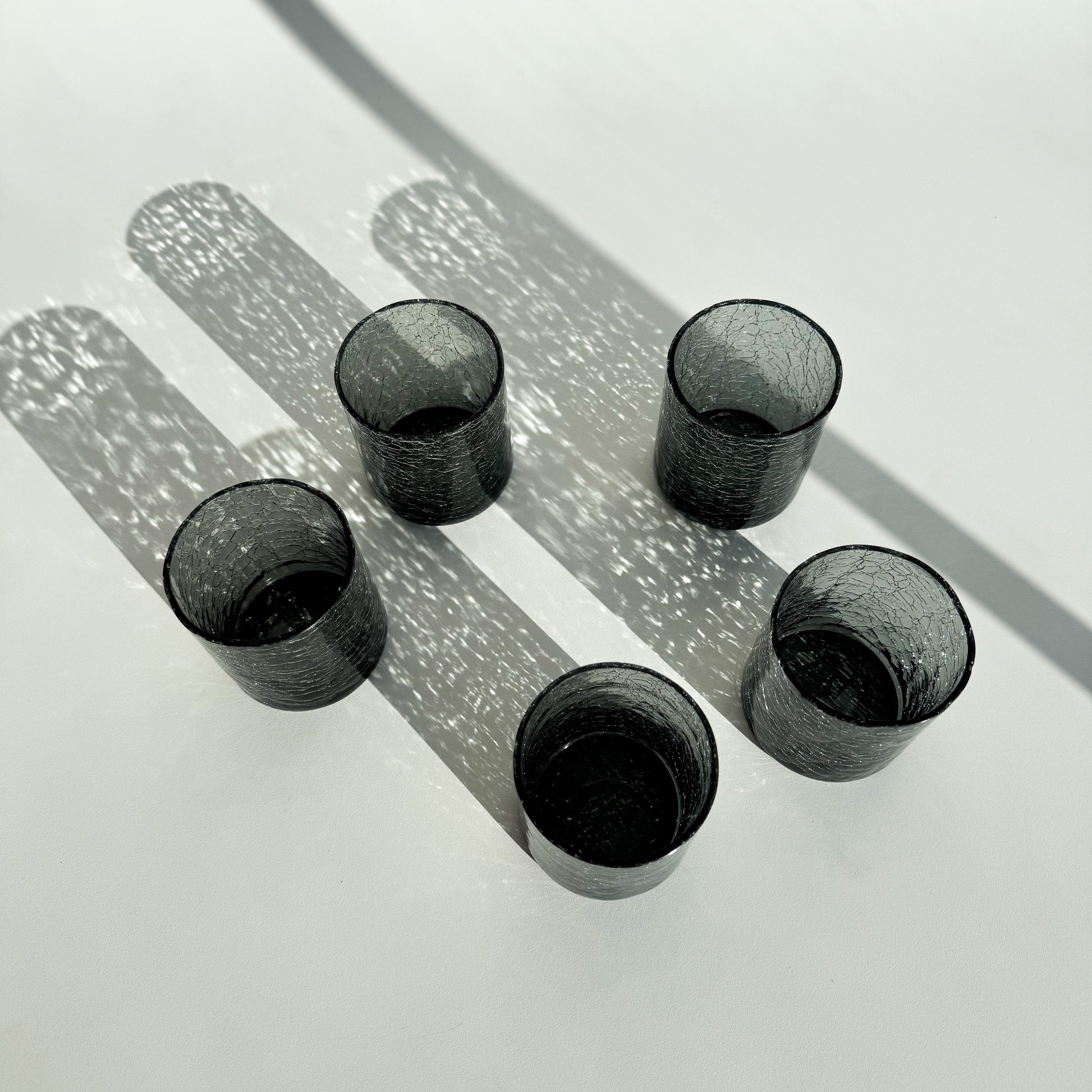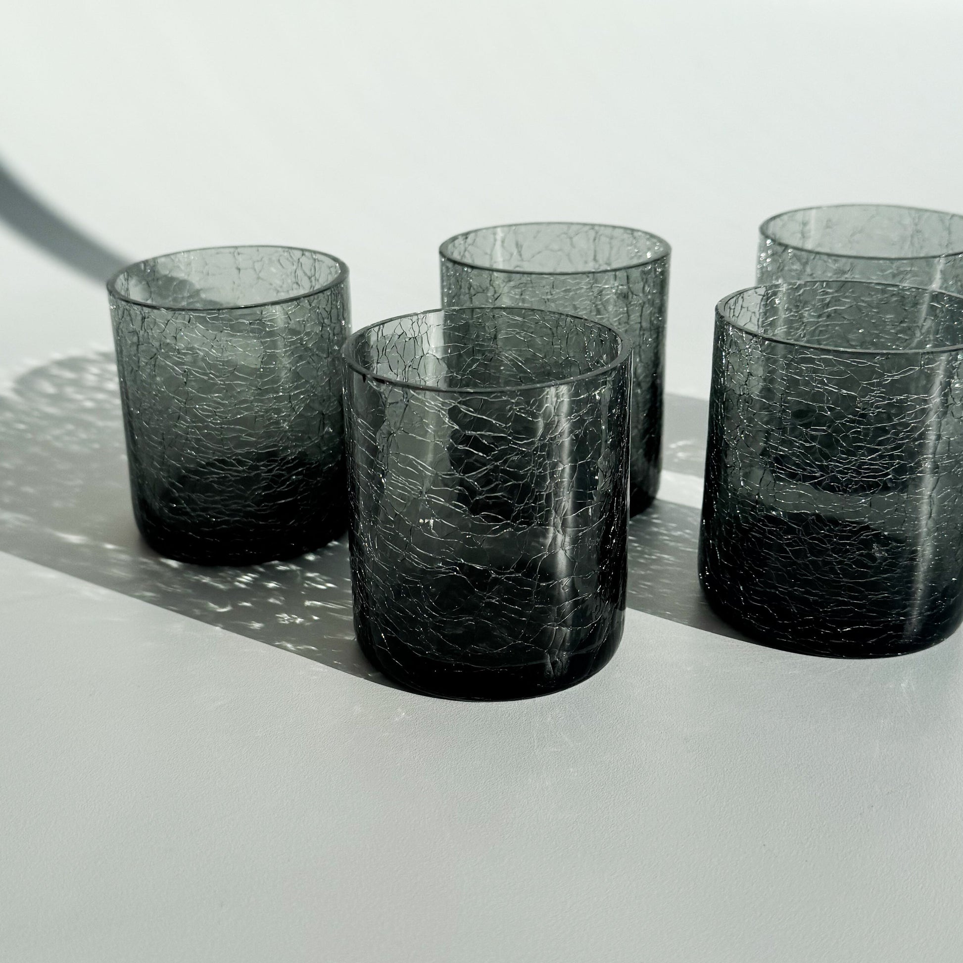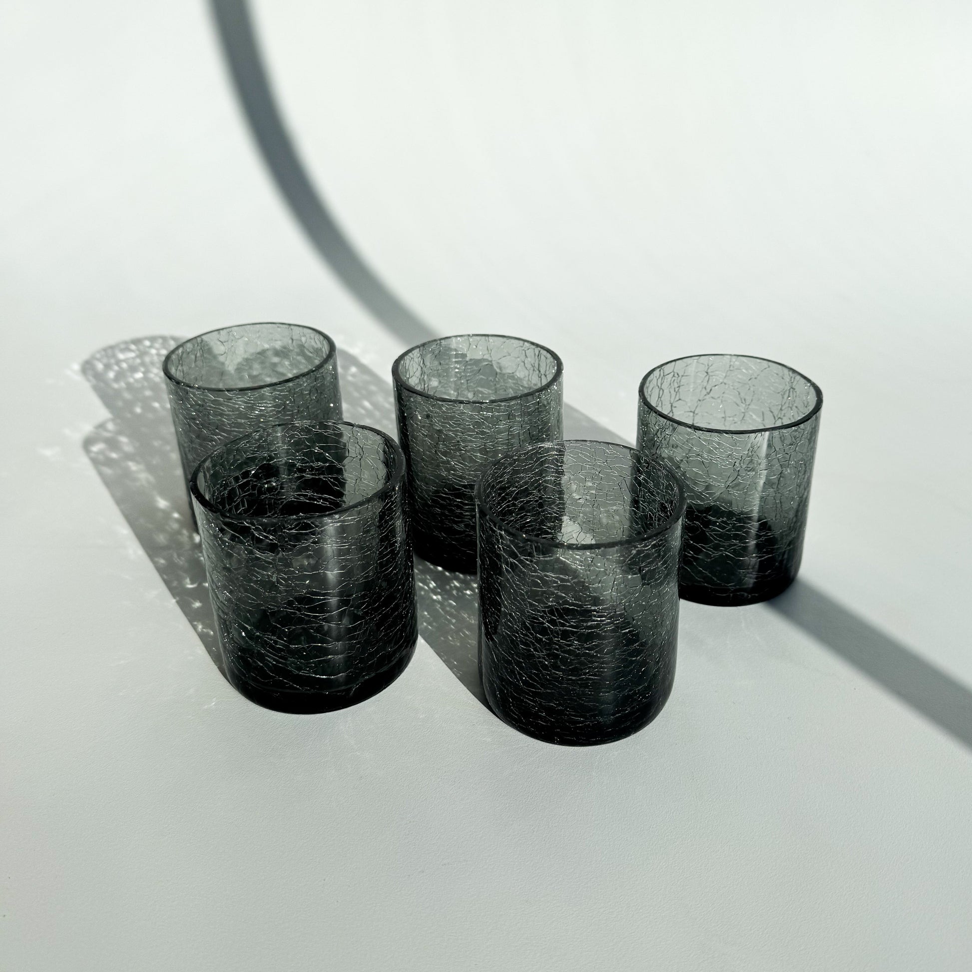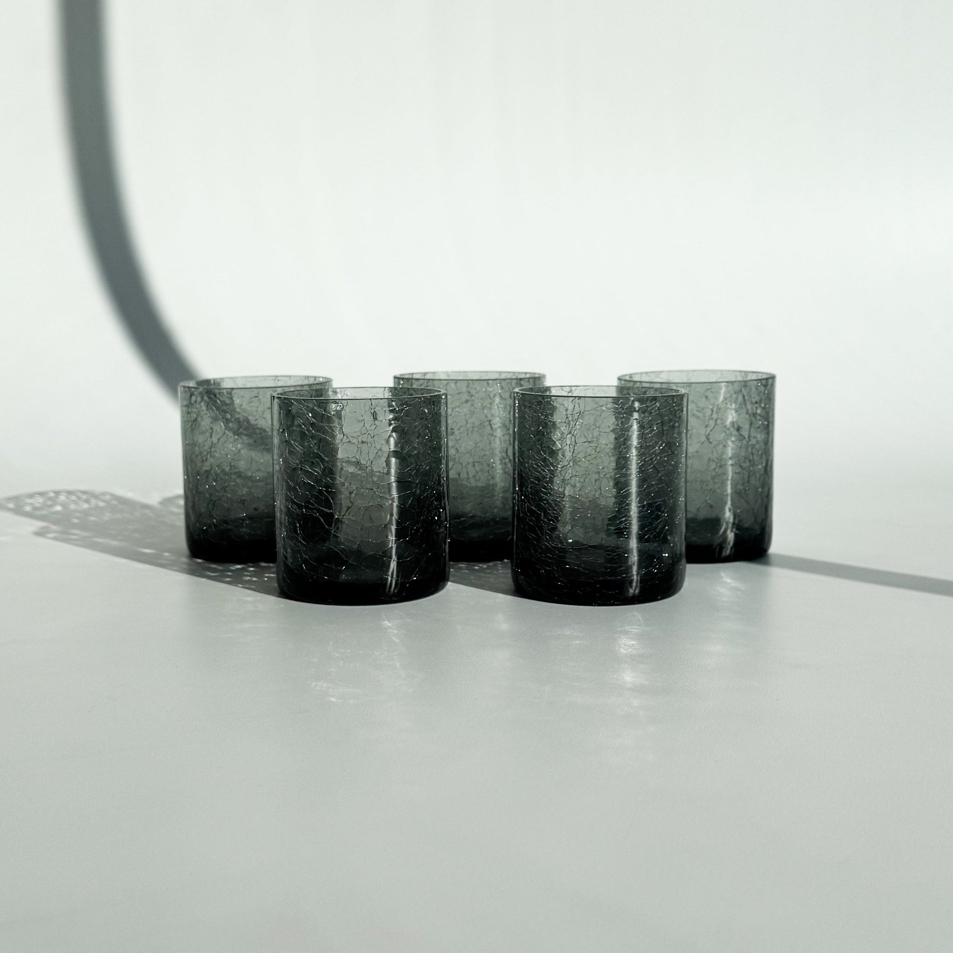 Conjunto com 5 copos em vidro com efeito craquelado e tonalidade cinza-fumê.
