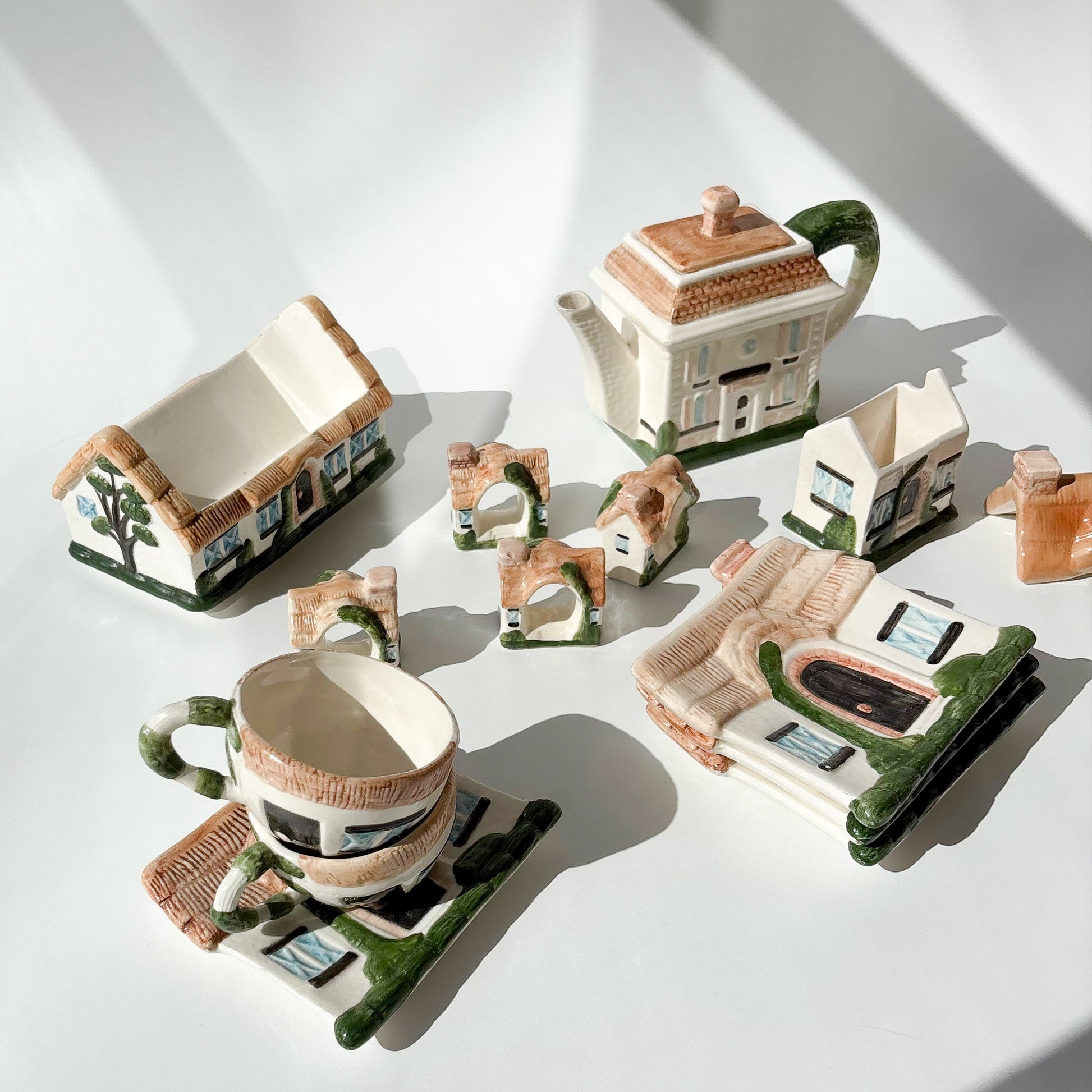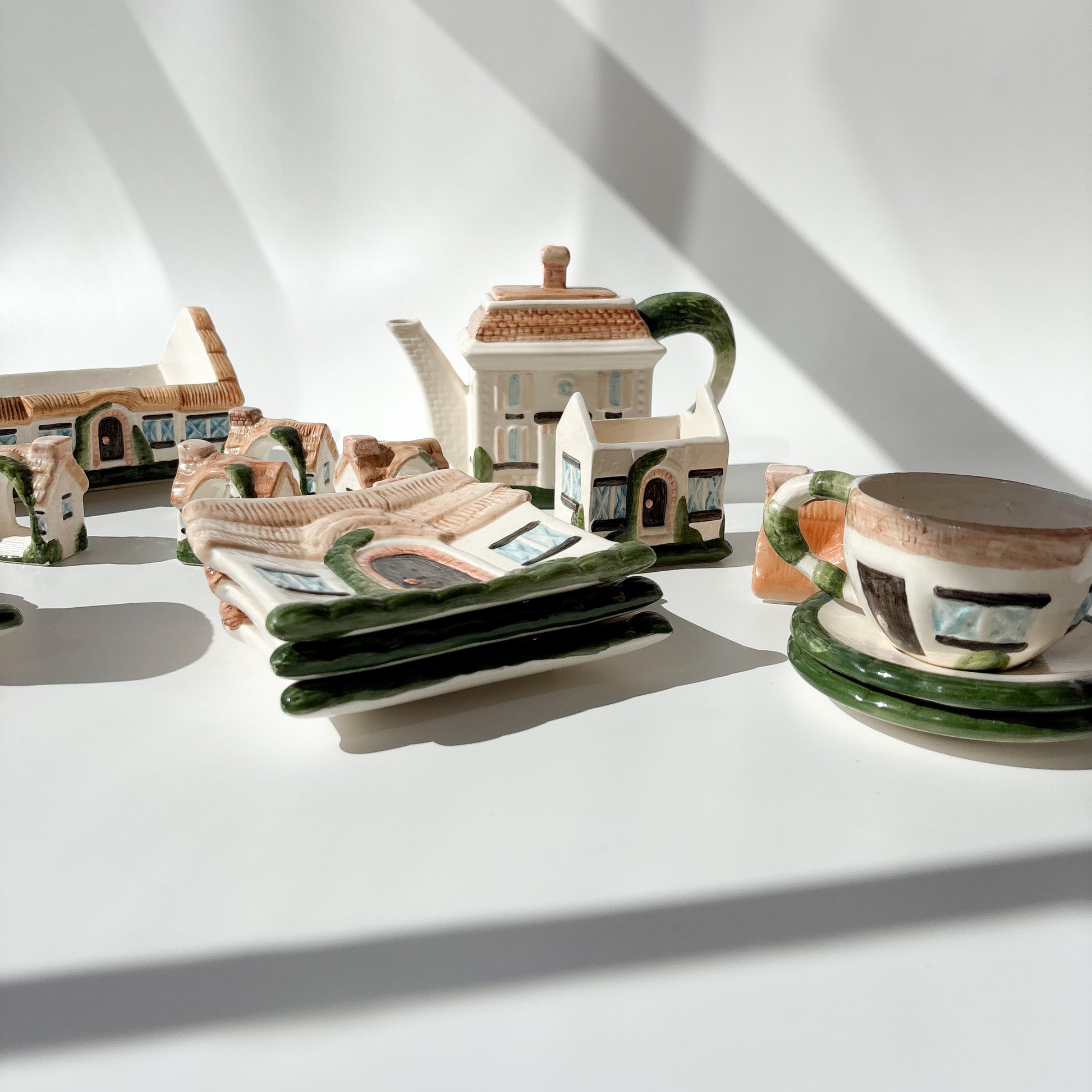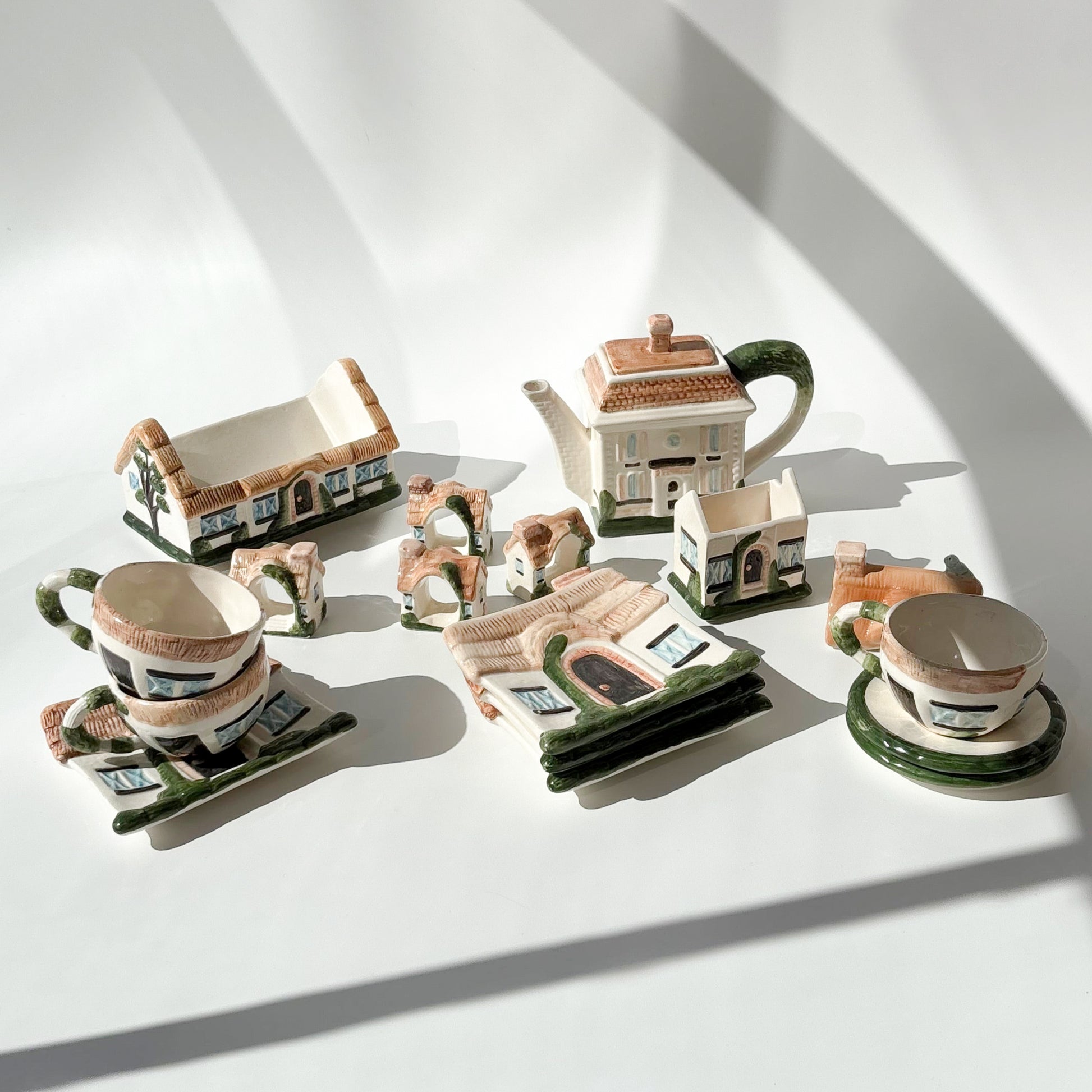 Serviço para chá e café em cerâmica pintado à mão, com 1 bule para café, 1 açucareiro, 1 porta-torradas, 3 xícaras para chá com pires, 4 porta-guardanapos individuais e 4 pratos para sobremesa.