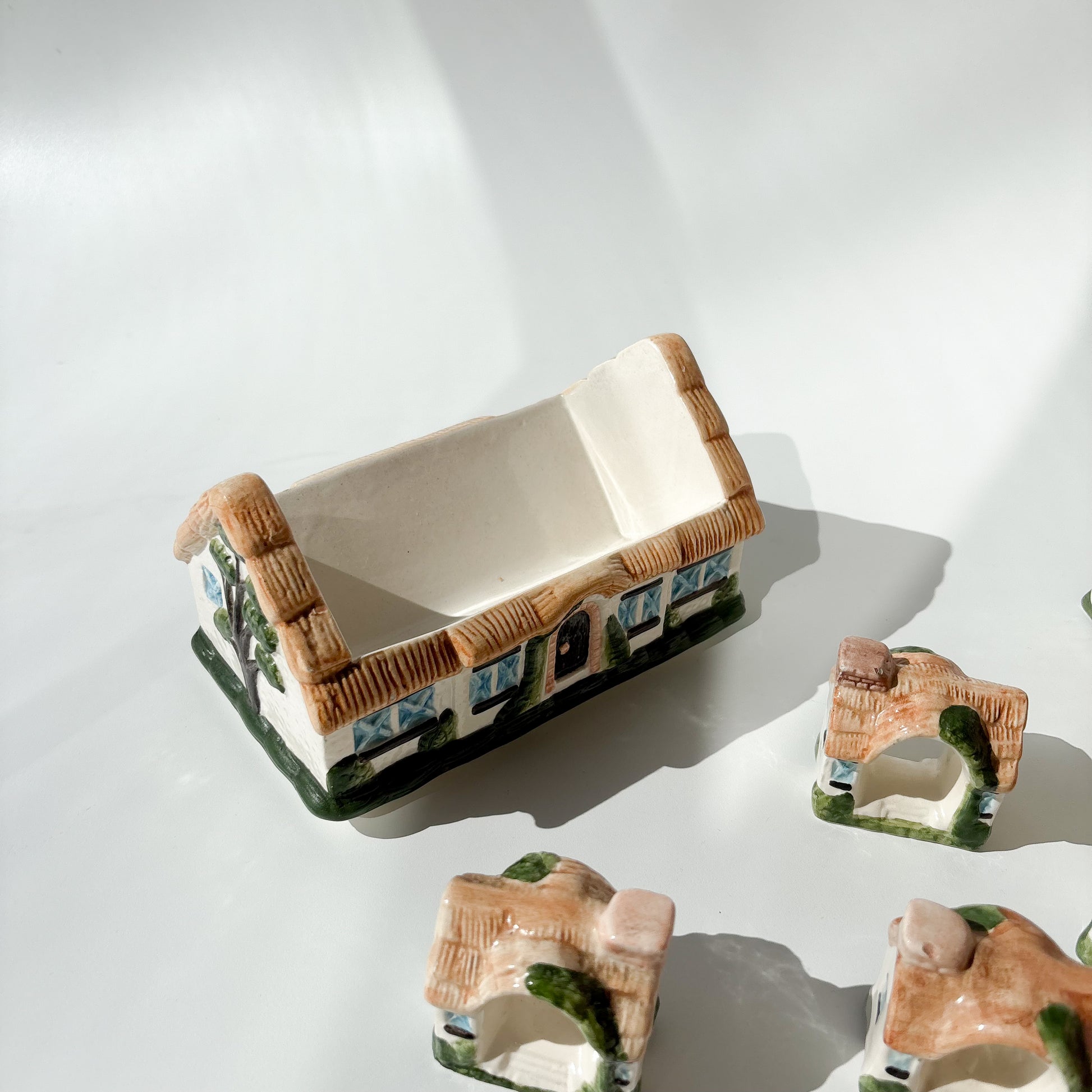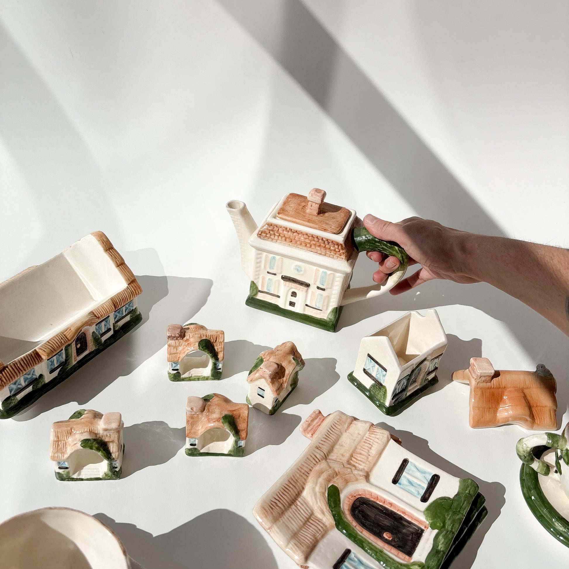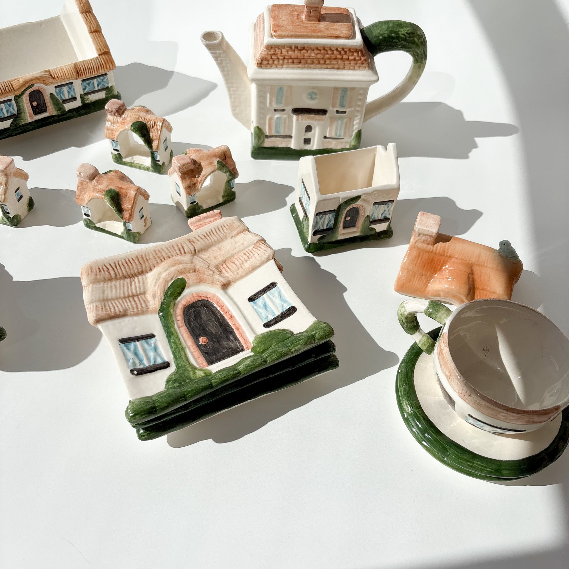 Serviço para chá e café em cerâmica pintado à mão, com 1 bule para café, 1 açucareiro, 1 porta-torradas, 3 xícaras para chá com pires, 4 porta-guardanapos individuais e 4 pratos para sobremesa.