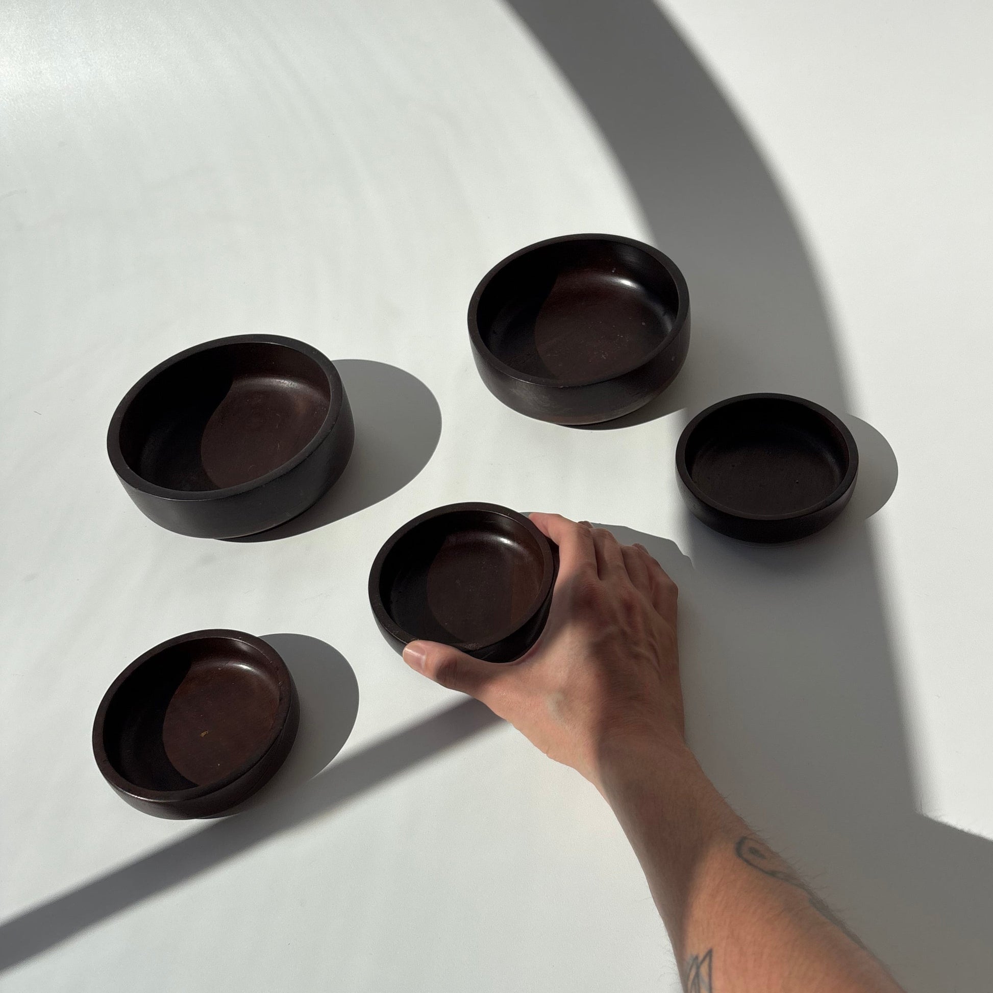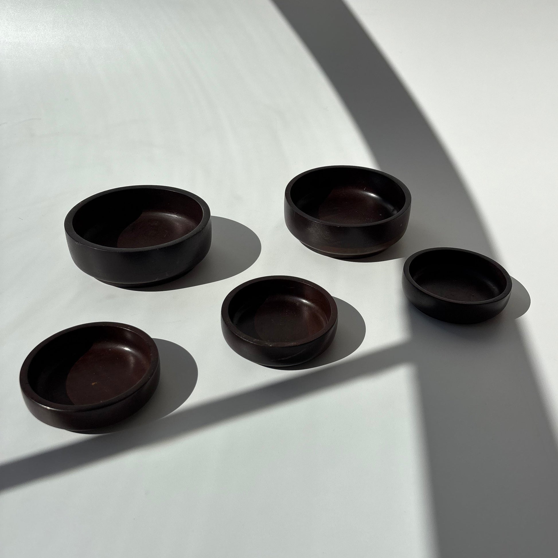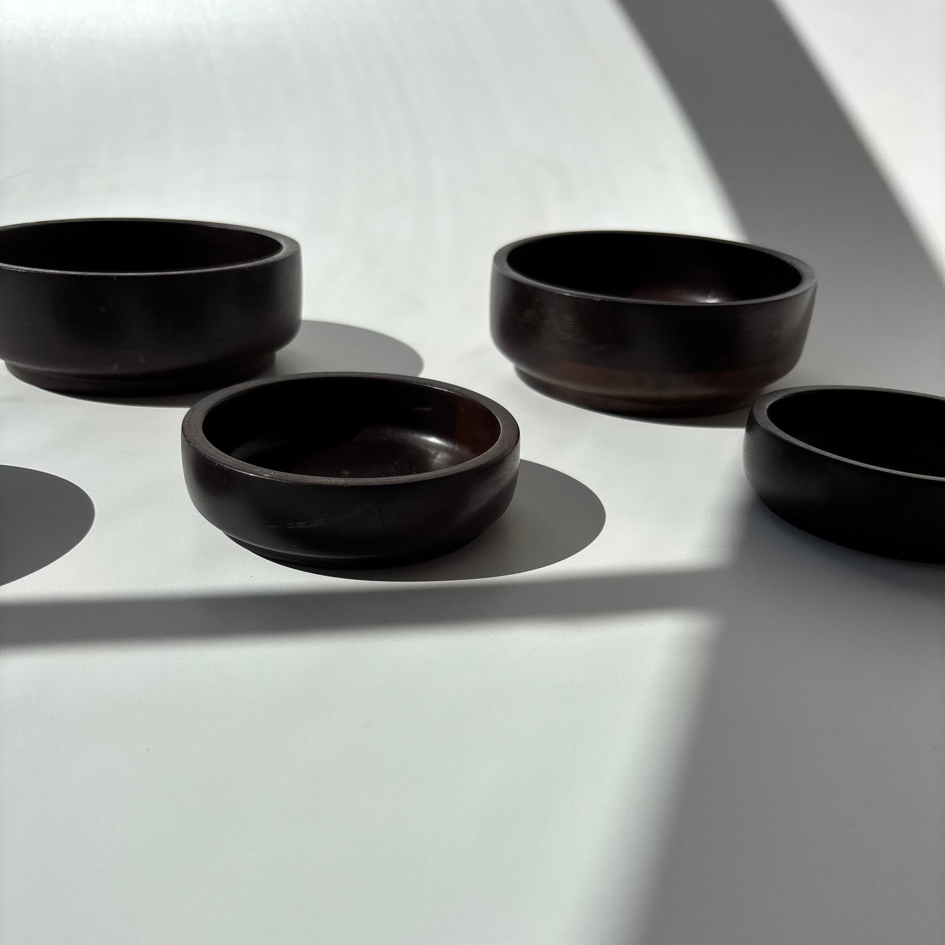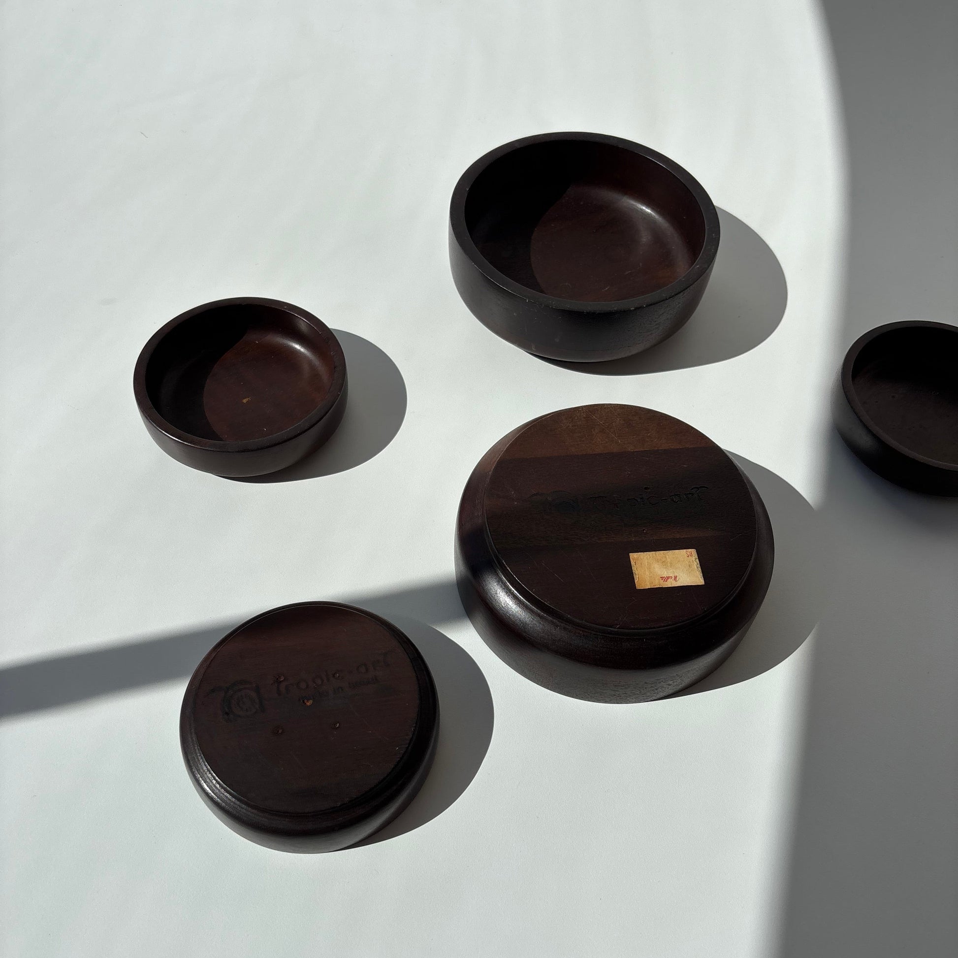 Conjunto de 5 petisqueiras produzidas em blocos de madeira de feitio circular, peças Tropic Art (marcado no verso).