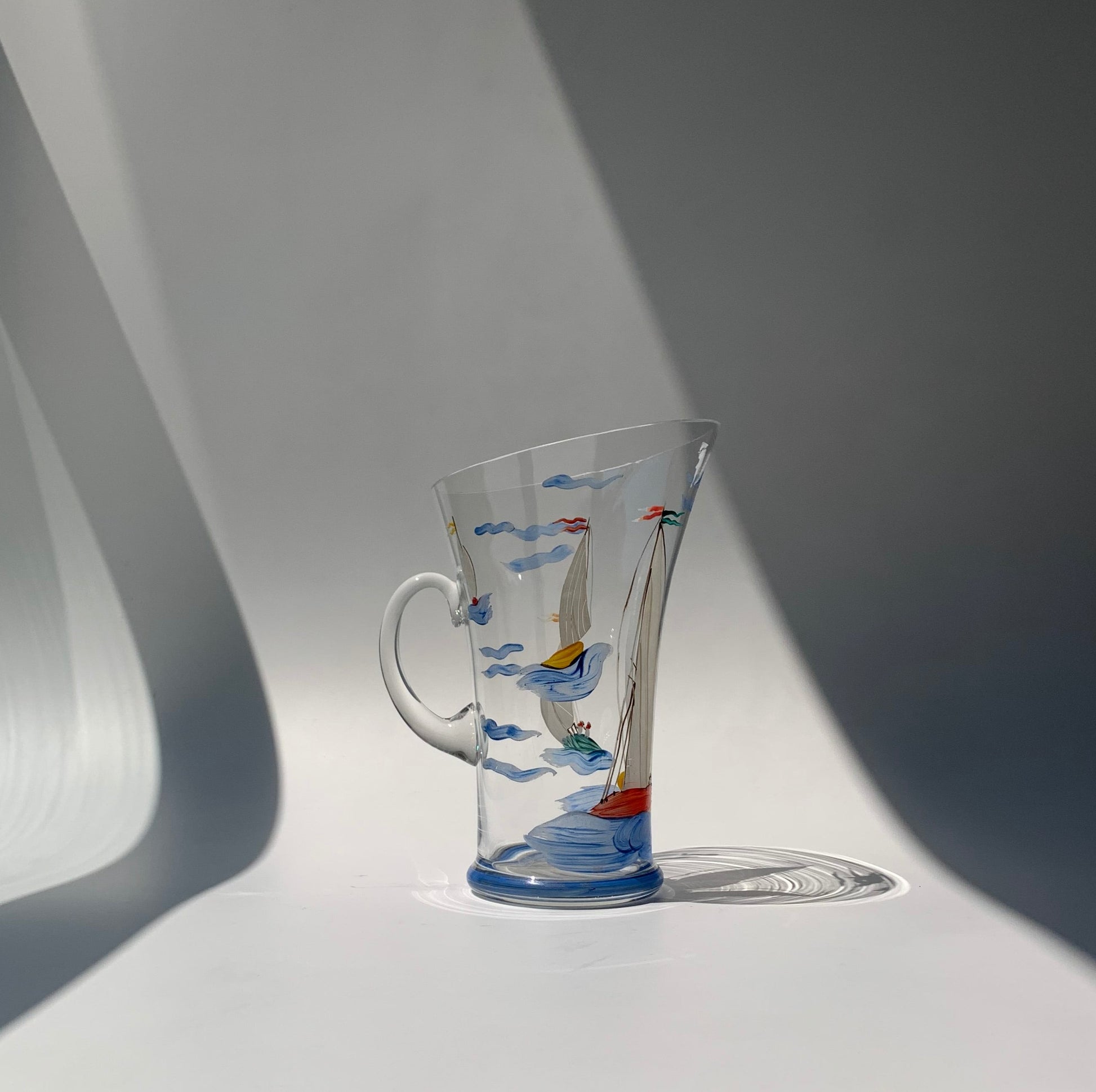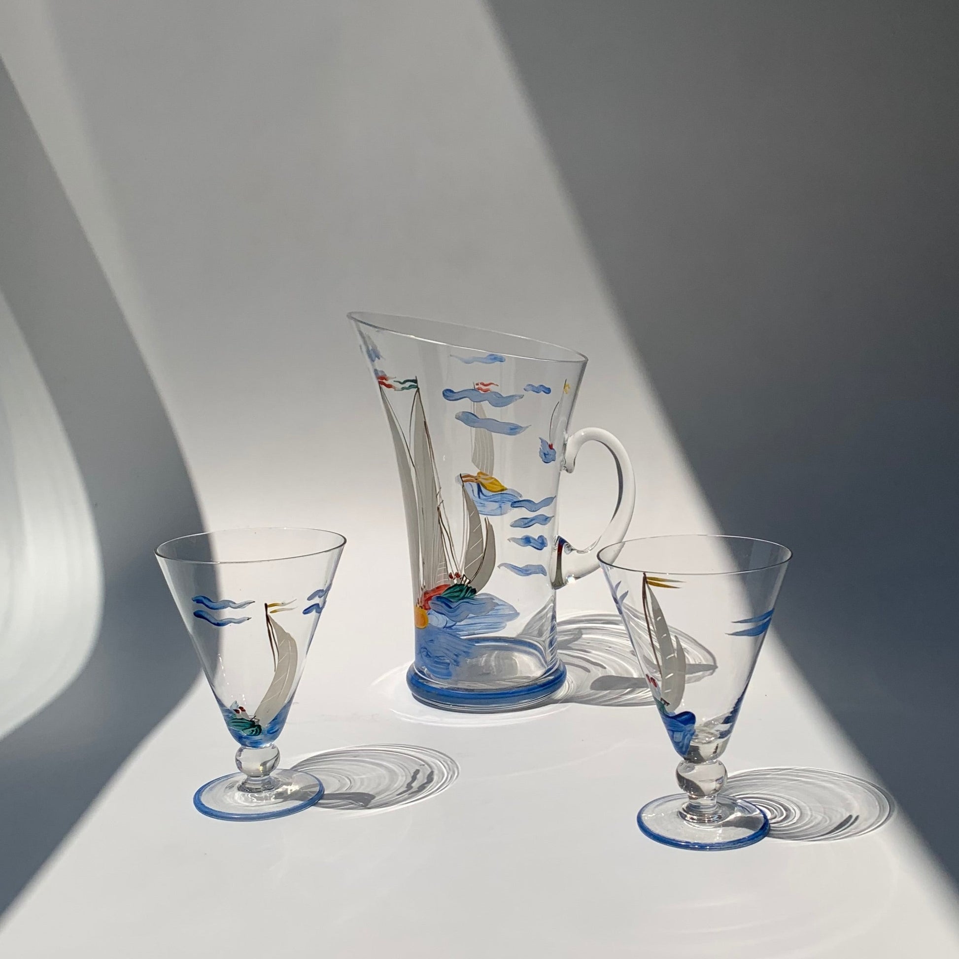Conjunto com jarra e dupla de taças em vidro pintados à mão