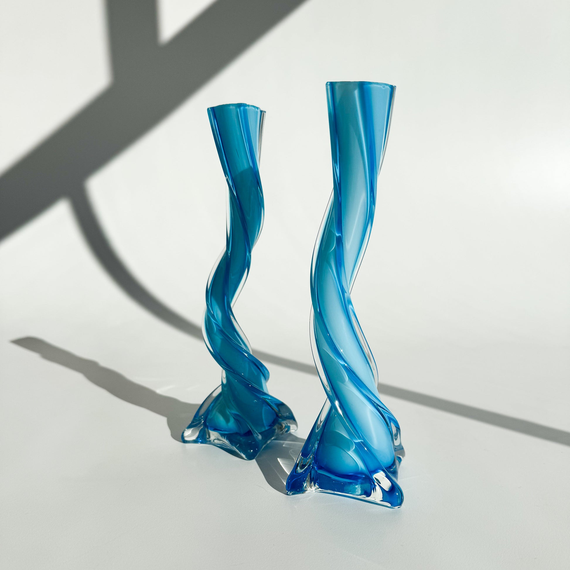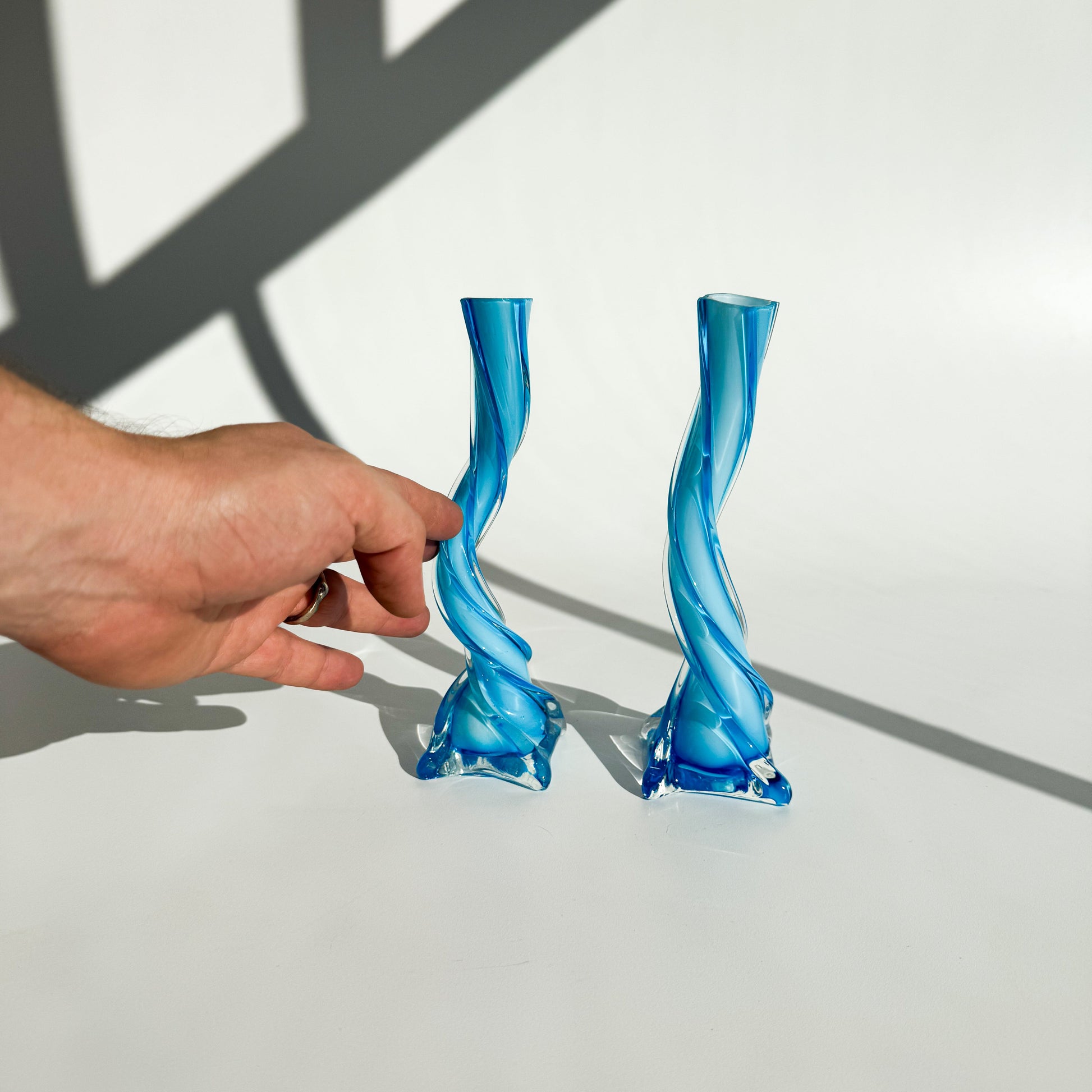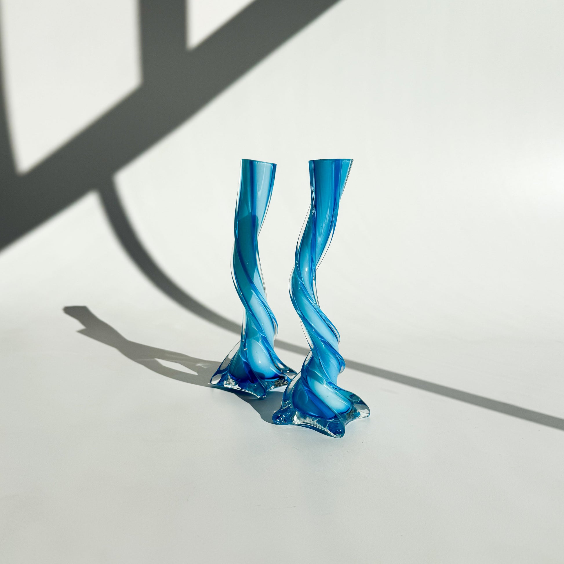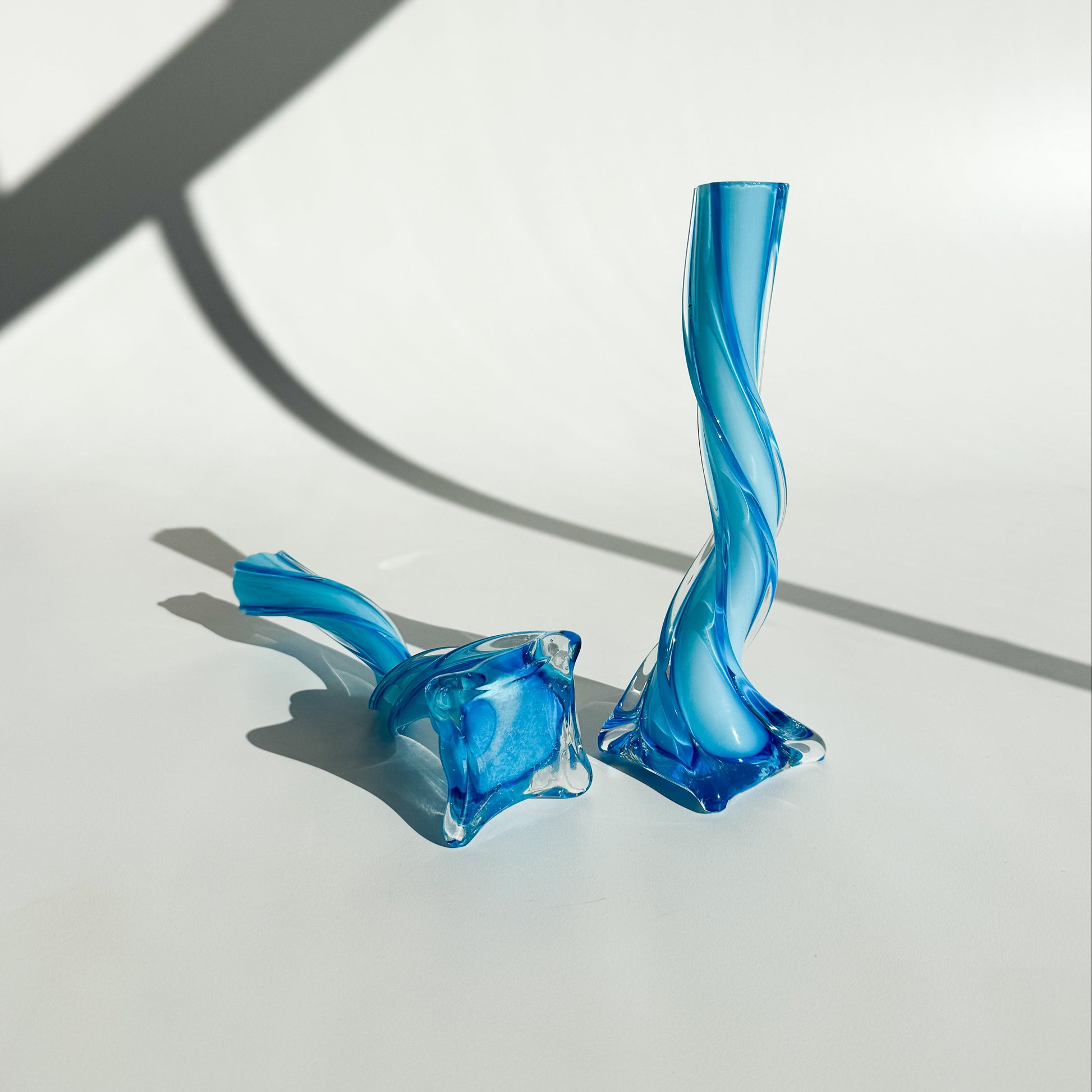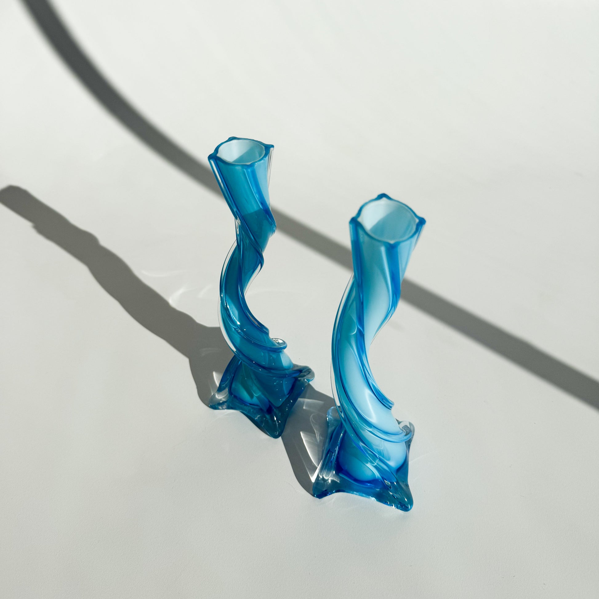 Dupla de solifleurs em vidro soprado, opalinado, azul e branco.