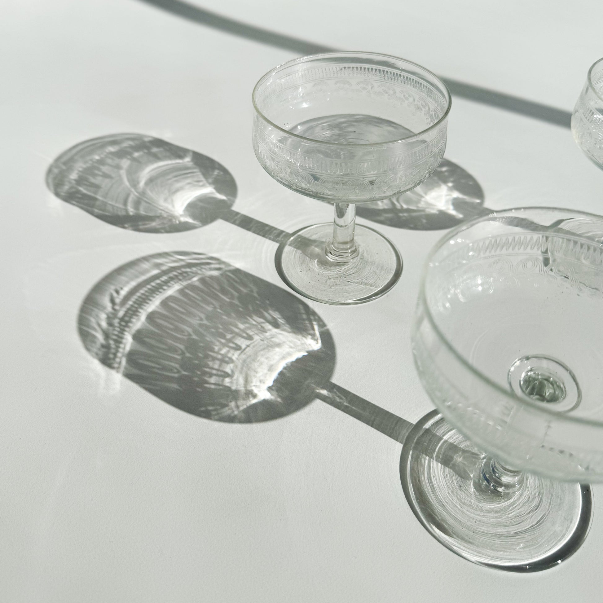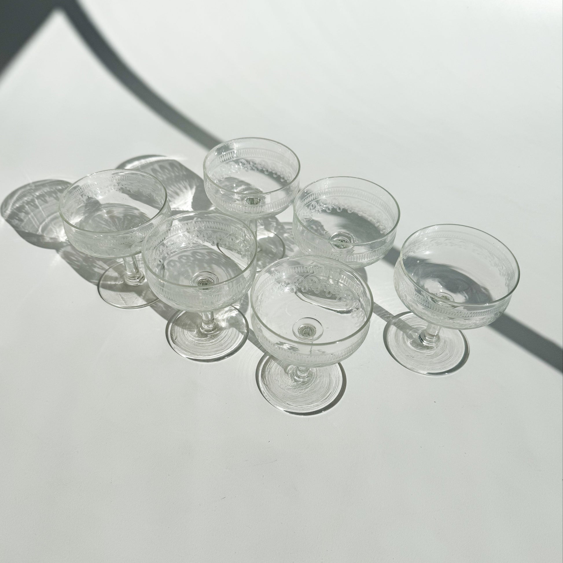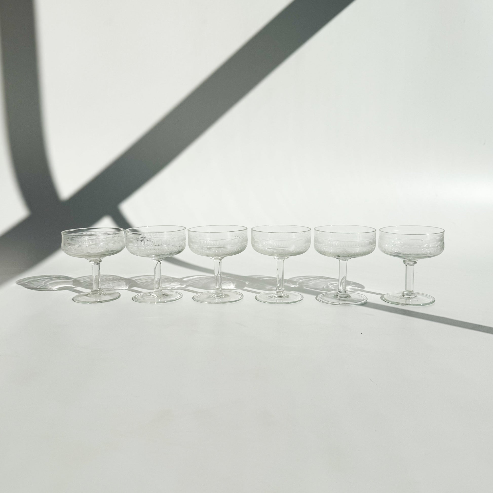 Conjunto com seis taças de cristal translúcido, lapidadas com motivos variados.