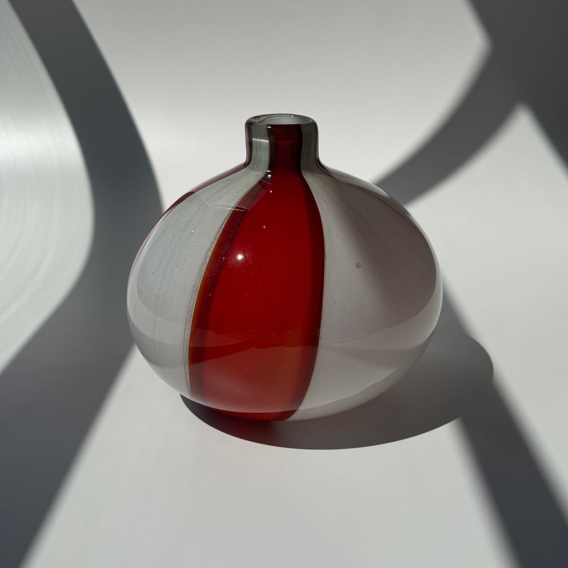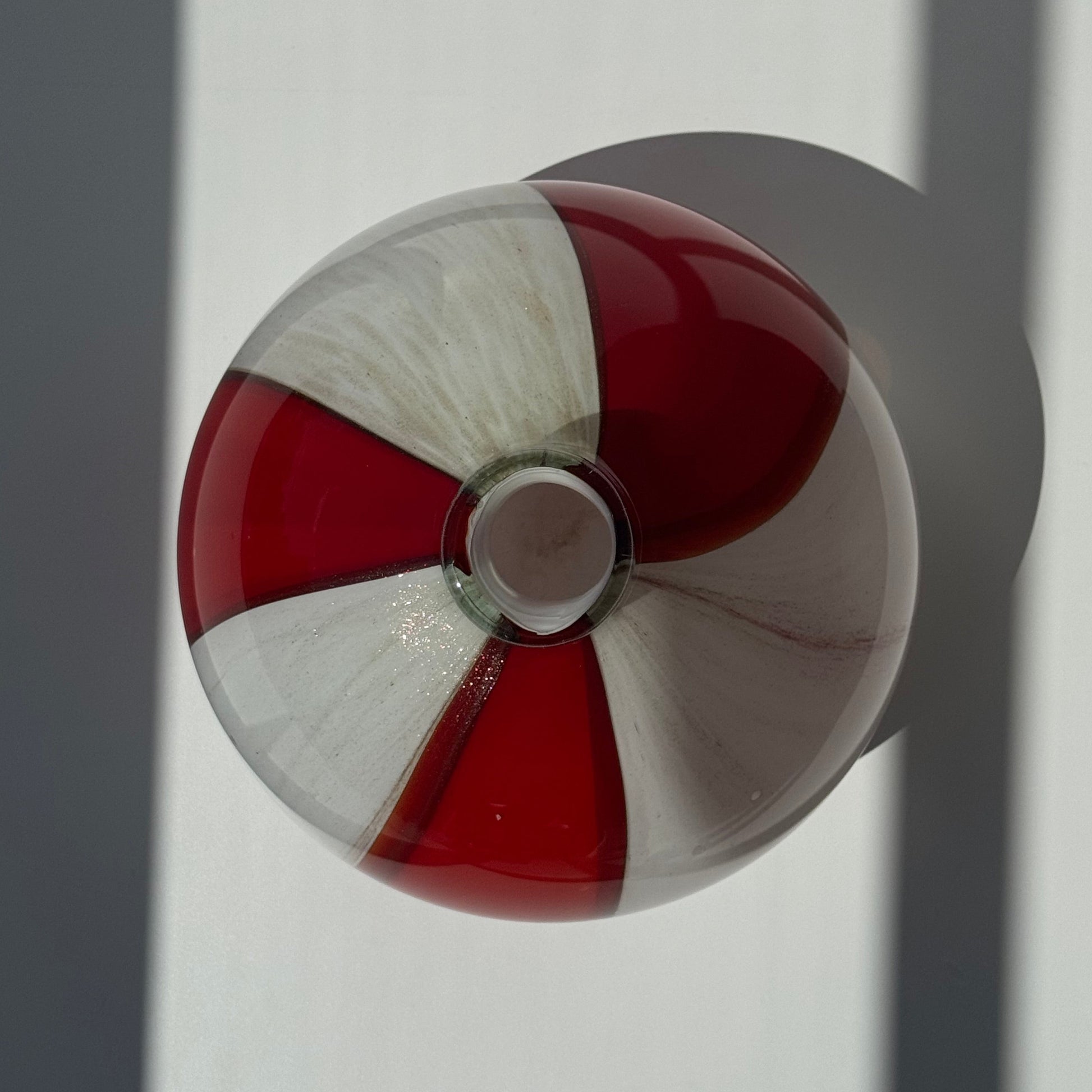 Vaso em vidro soprado, cor vermelha e branco com pó de ouro.