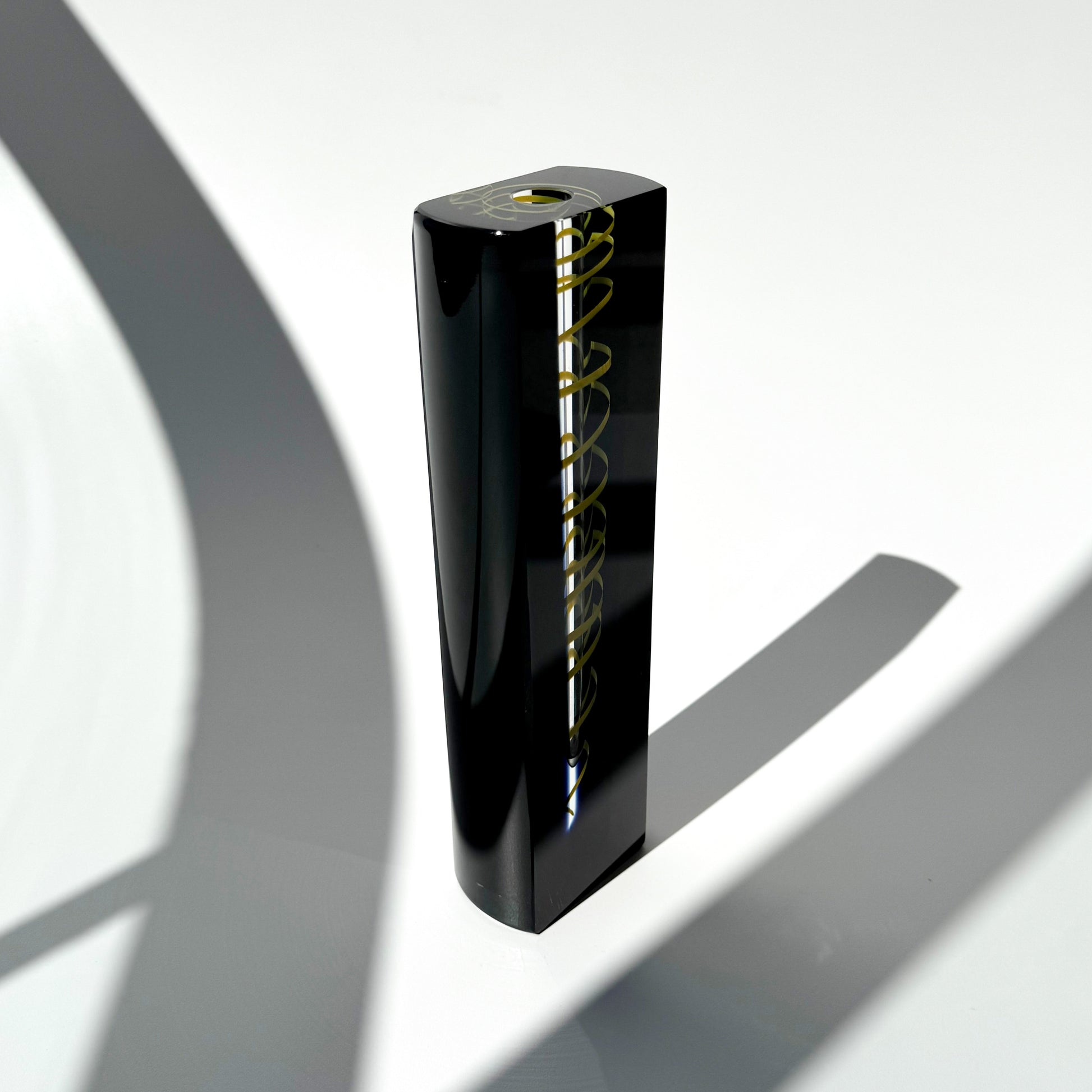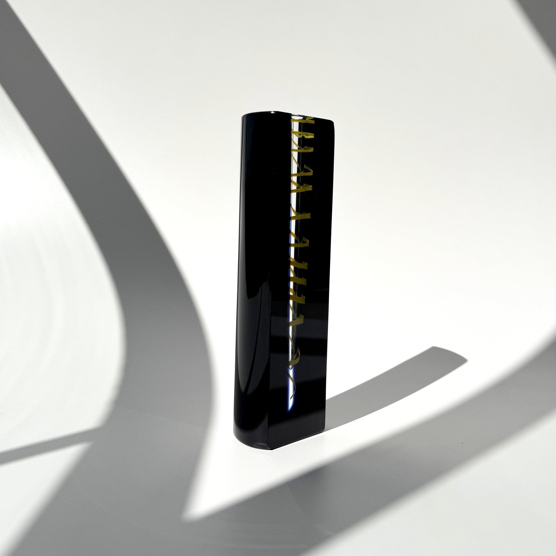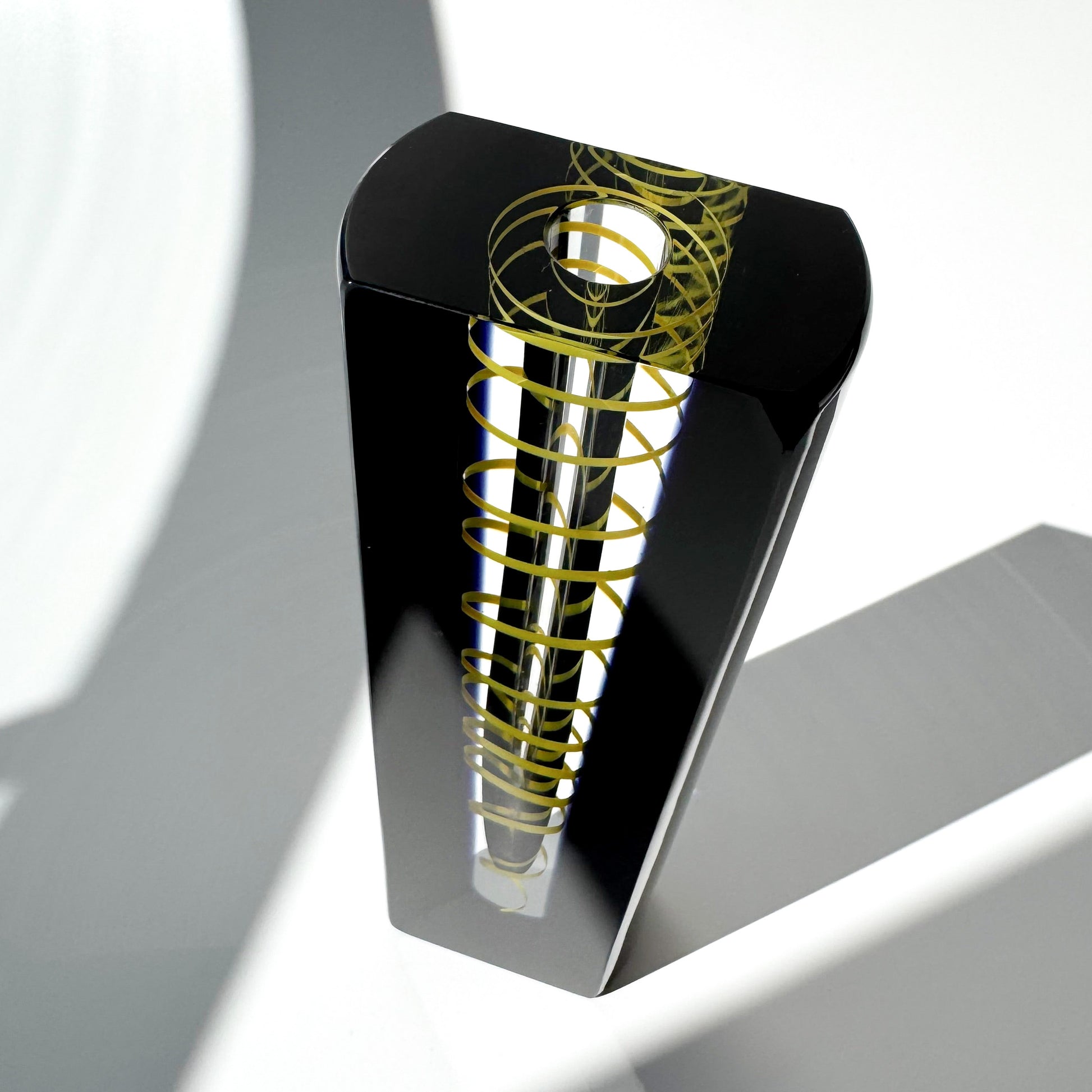 Vaso em técnica mista de vidro. Em luz ambiente, aparenta ser predominantemente da cor preta, contra luz o vidro aparenta ter a coloração roxa.