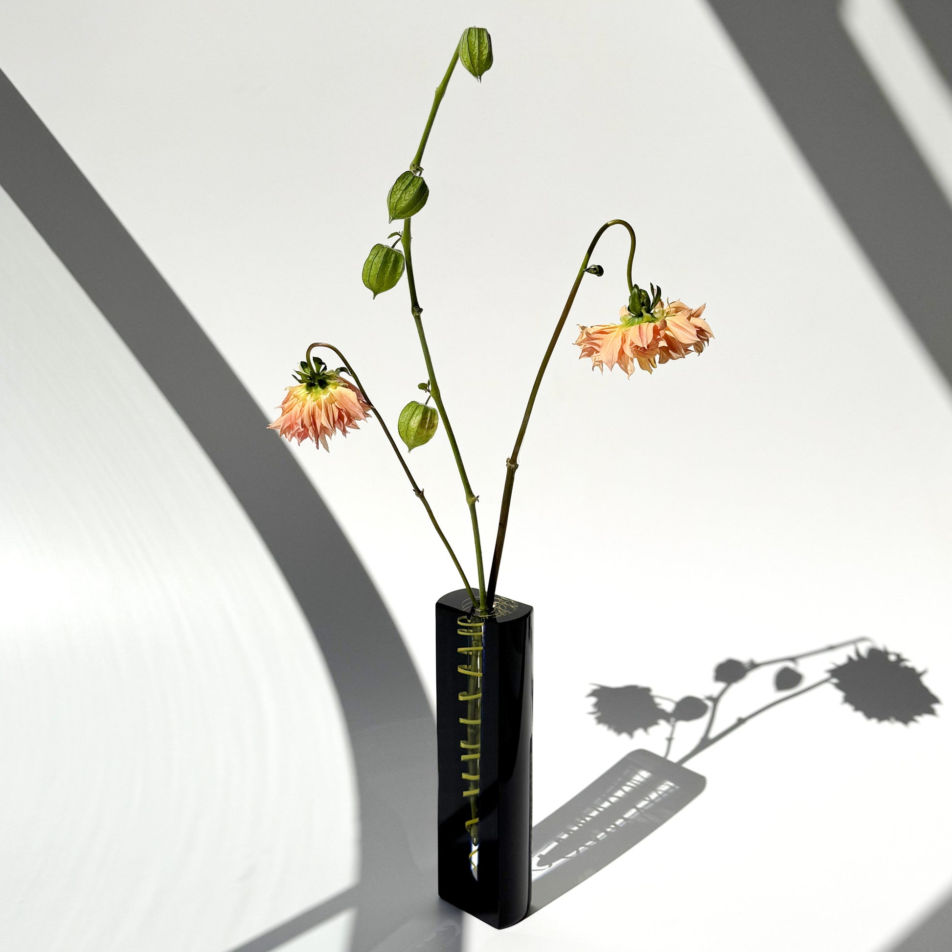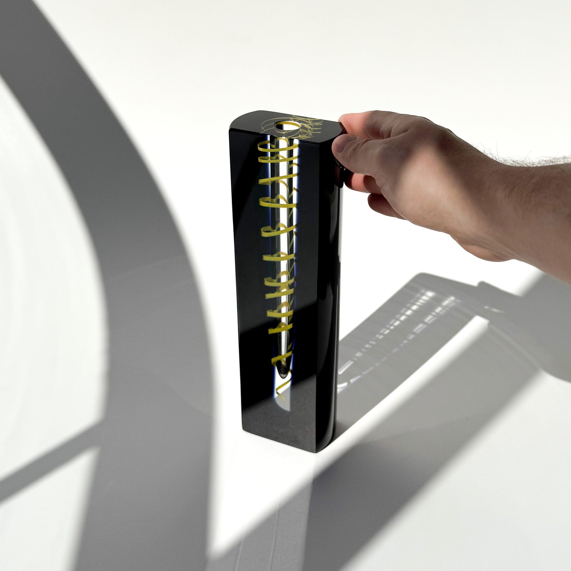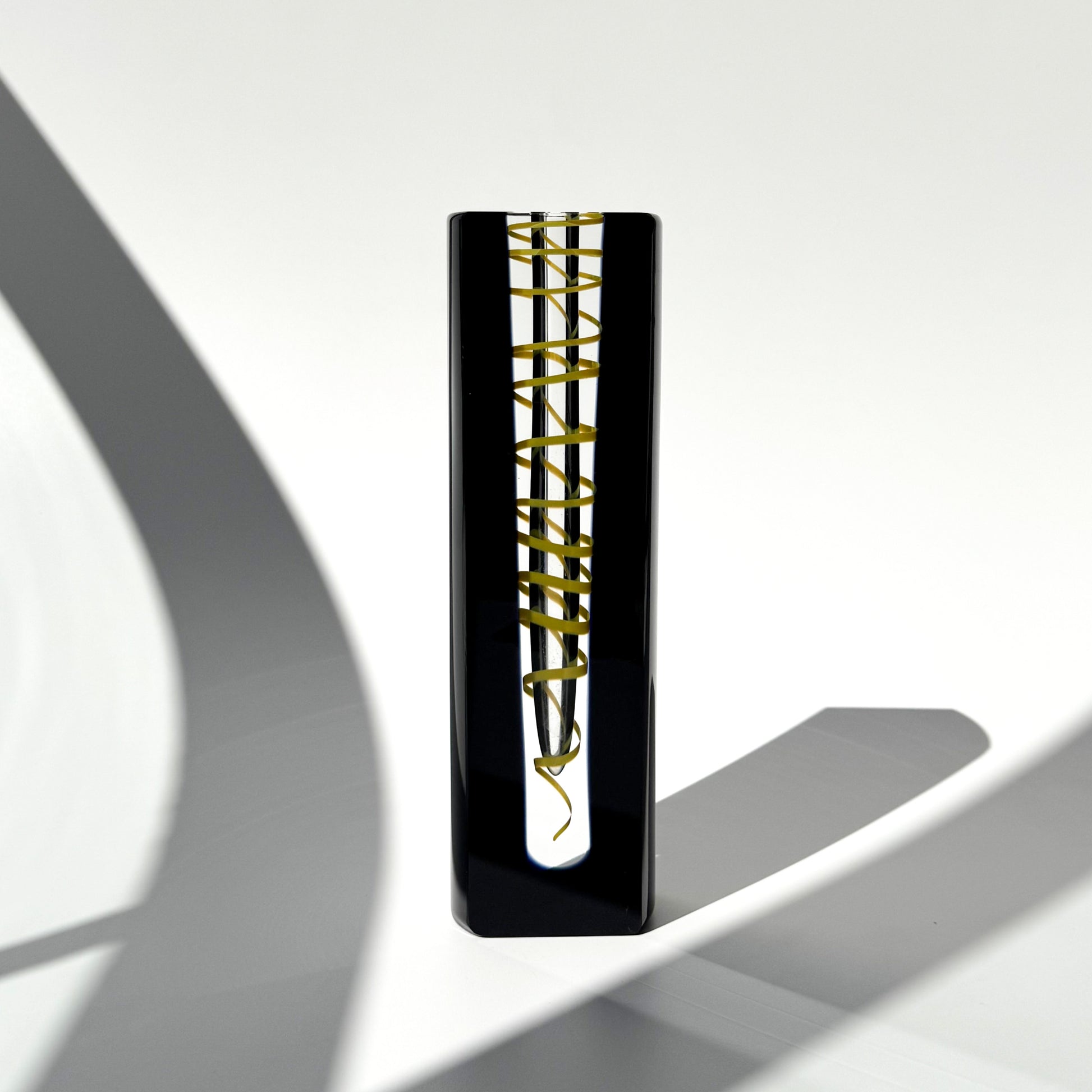 Vaso em técnica mista de vidro. Em luz ambiente, aparenta ser predominantemente da cor preta, contra luz o vidro aparenta ter a coloração roxa.