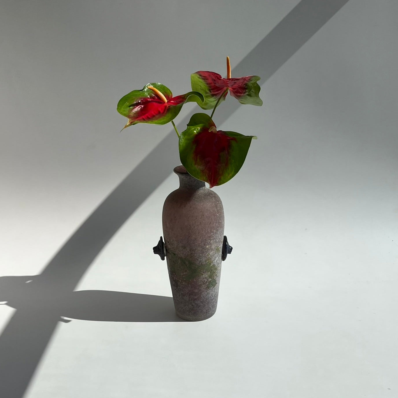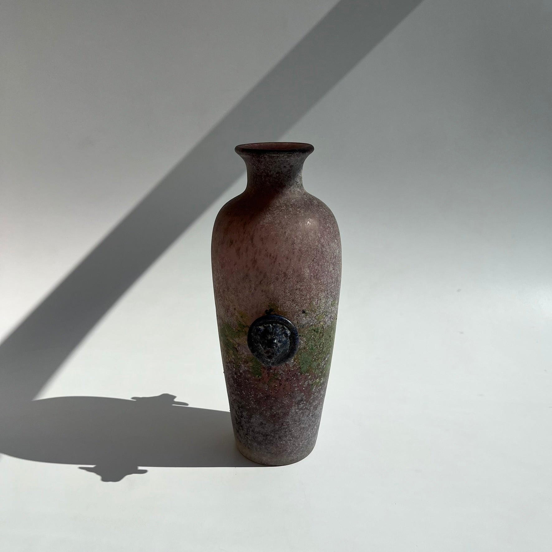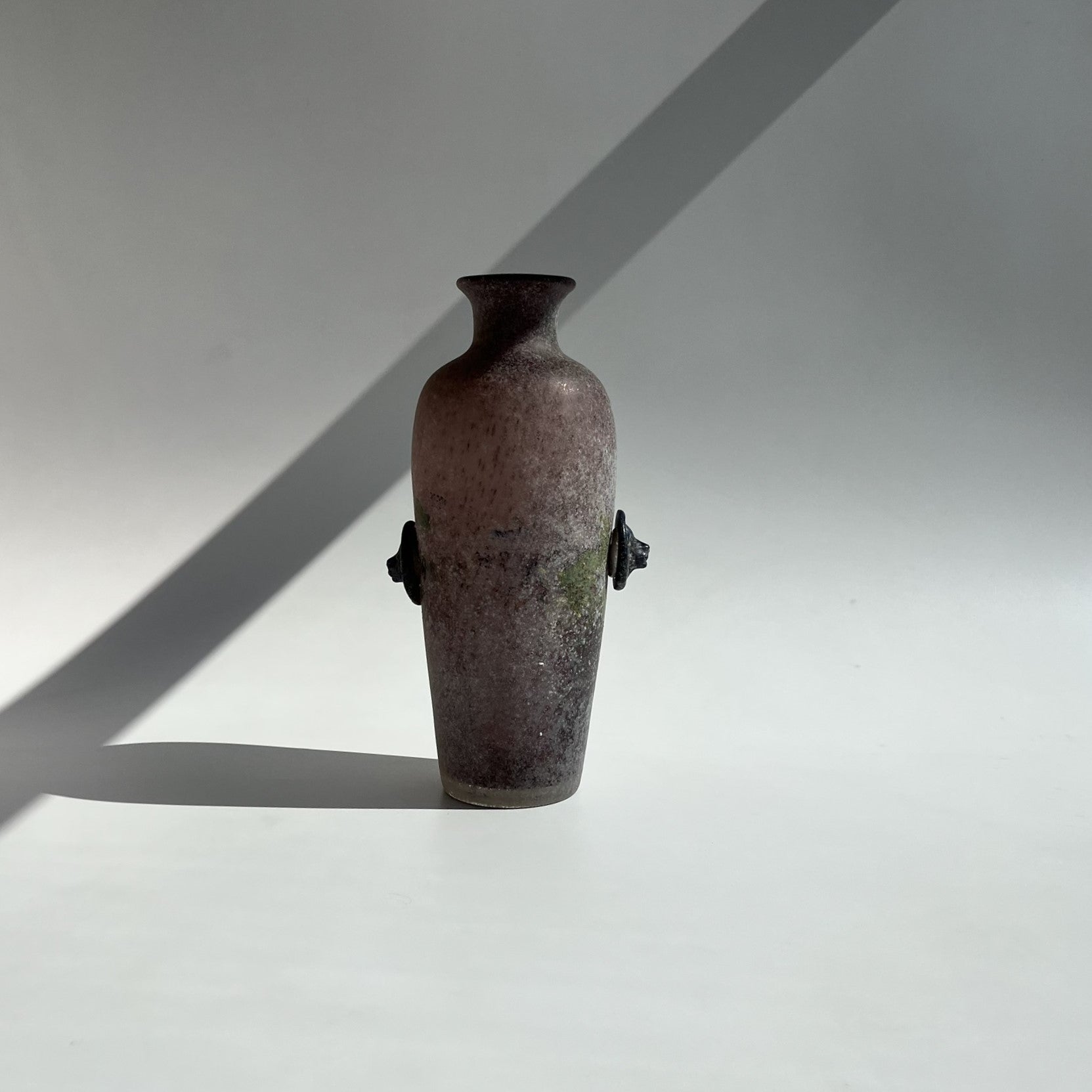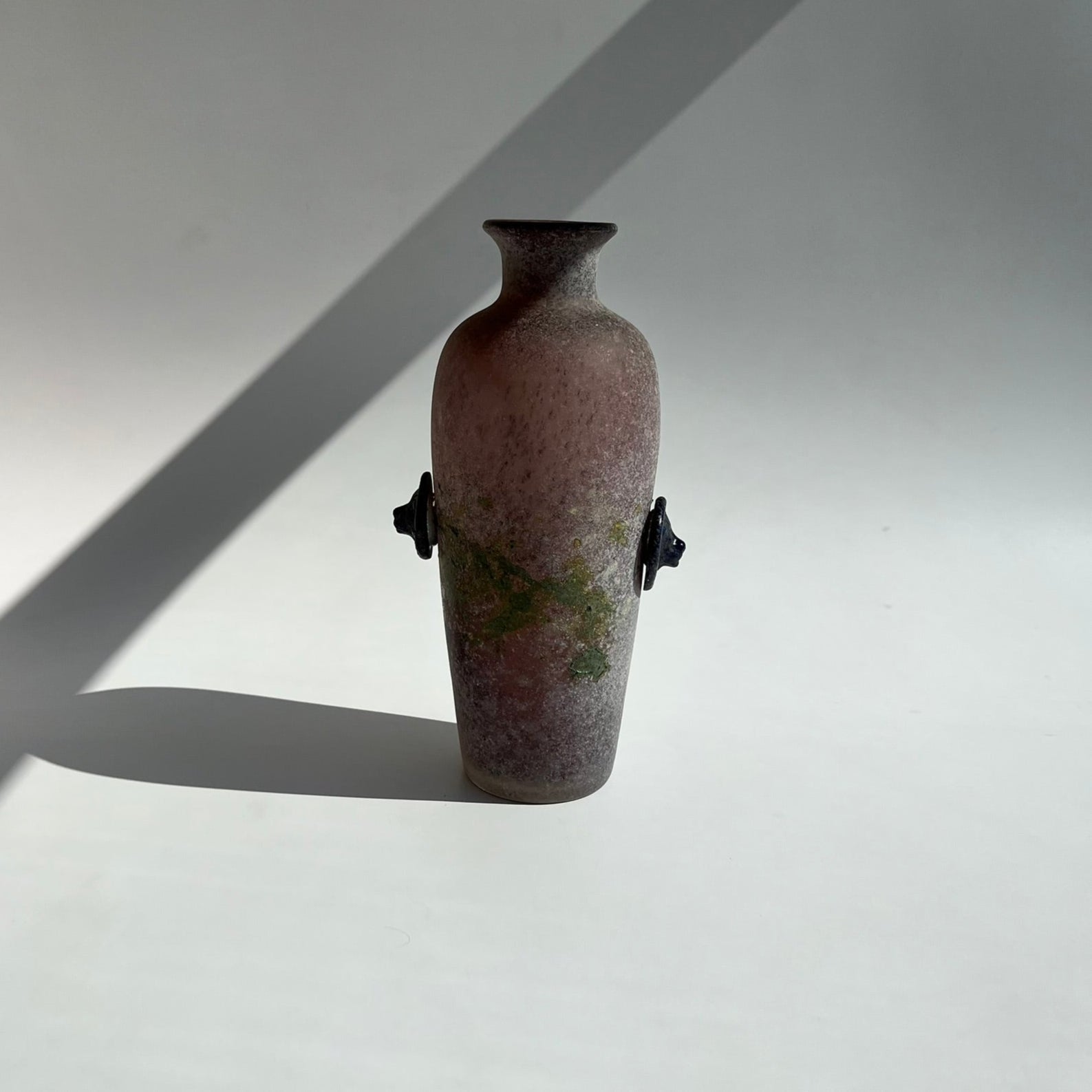 Vaso em vidro soprado com dois botões de vidro nas laterais e tinta verde no corpo, conforme fotos
